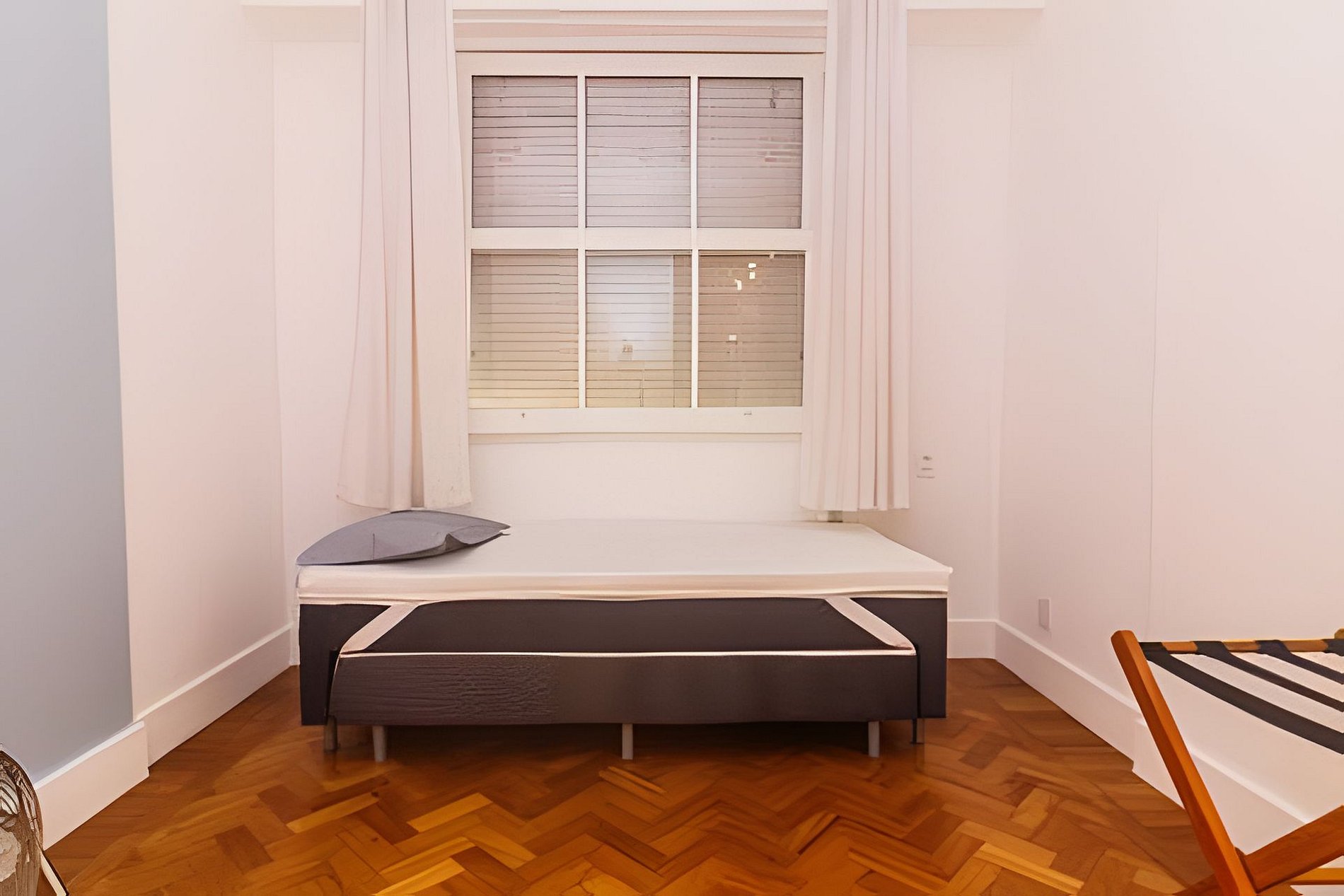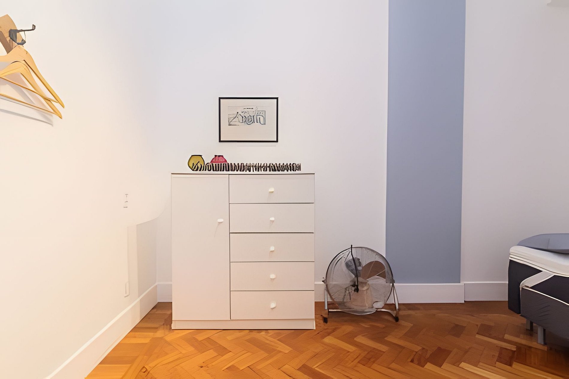 In the second room, integrated with the living room, luggage support, dresser (wardrobe) and a floor fan.