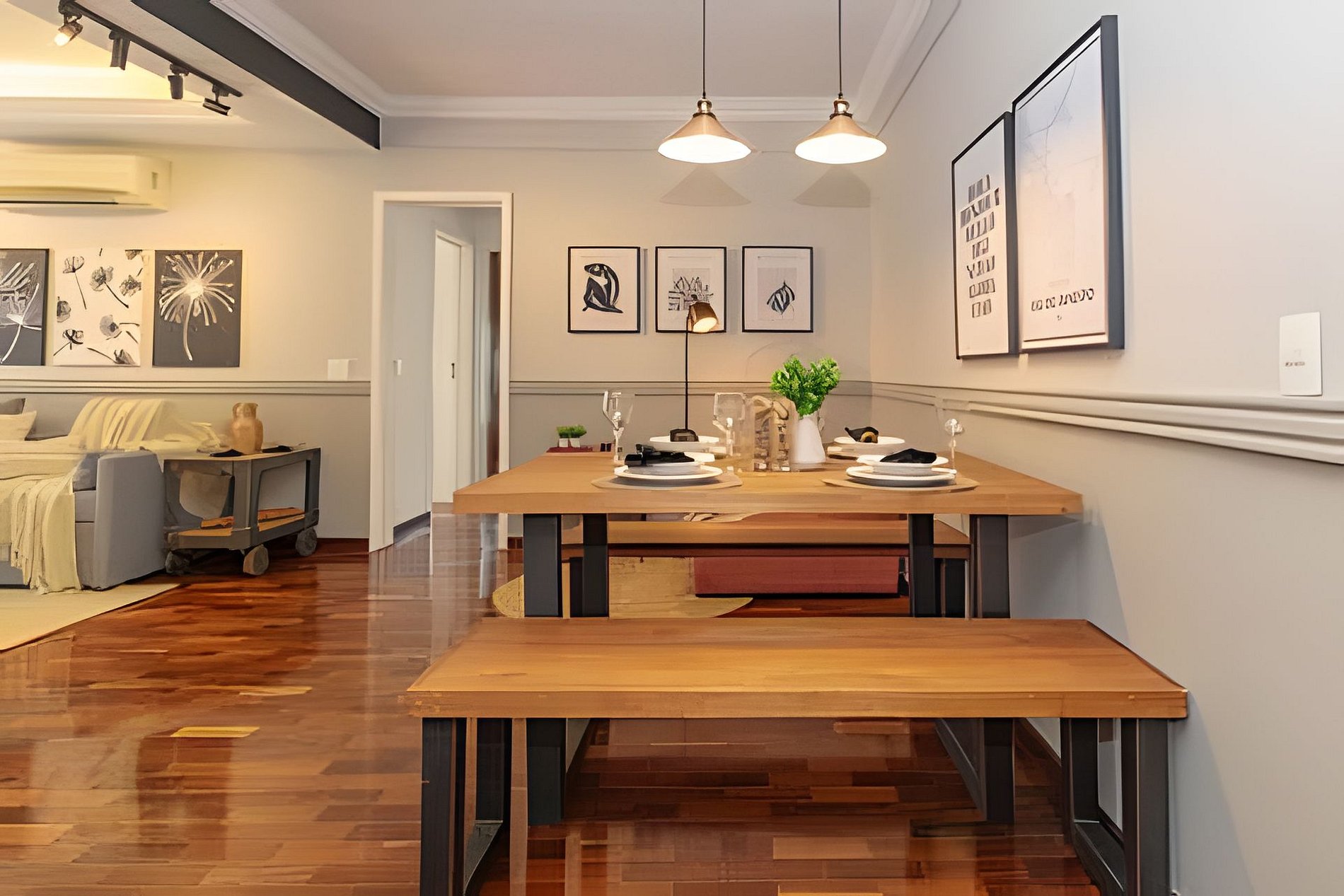 The apartment was recently decorated with great style and comfort and offers everything you need for a perfect stay. It is distributed in a spacious living room with a comfortable double sofa bed, Costela armchair, furnished balcony, split air conditioning and smart Tv. The dining room has a table and counter for 6 people to enjoy their meals and is integrated with a kitchen equipped with utensils (plates, cutlery, glasses, pots) and appliances such as refrigerator, stove, oven, microwave, blender, toaster, coffee maker. In the service area we can find a washing machine, ceiling clothesline and iron and ironing board.