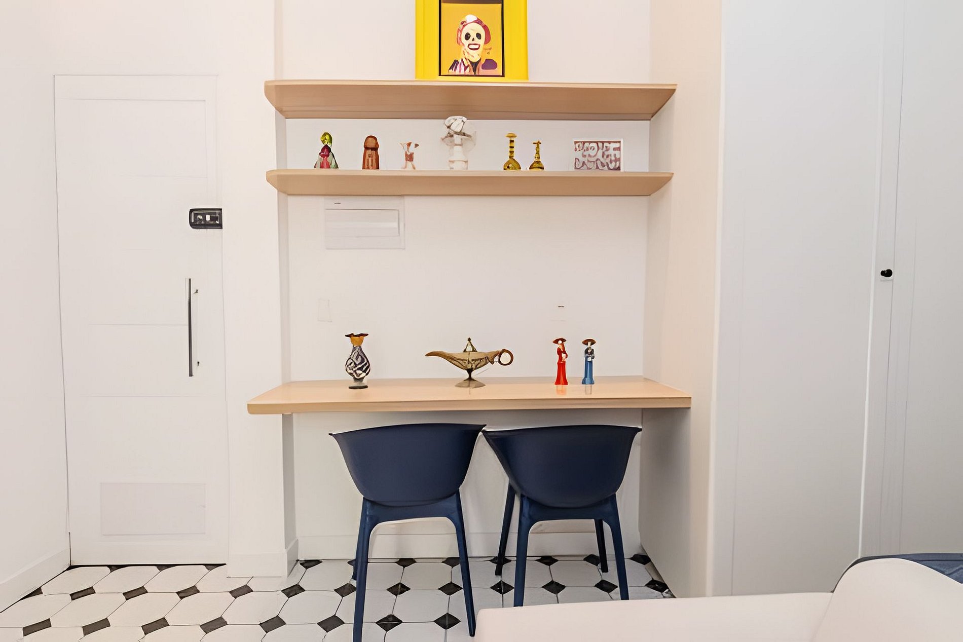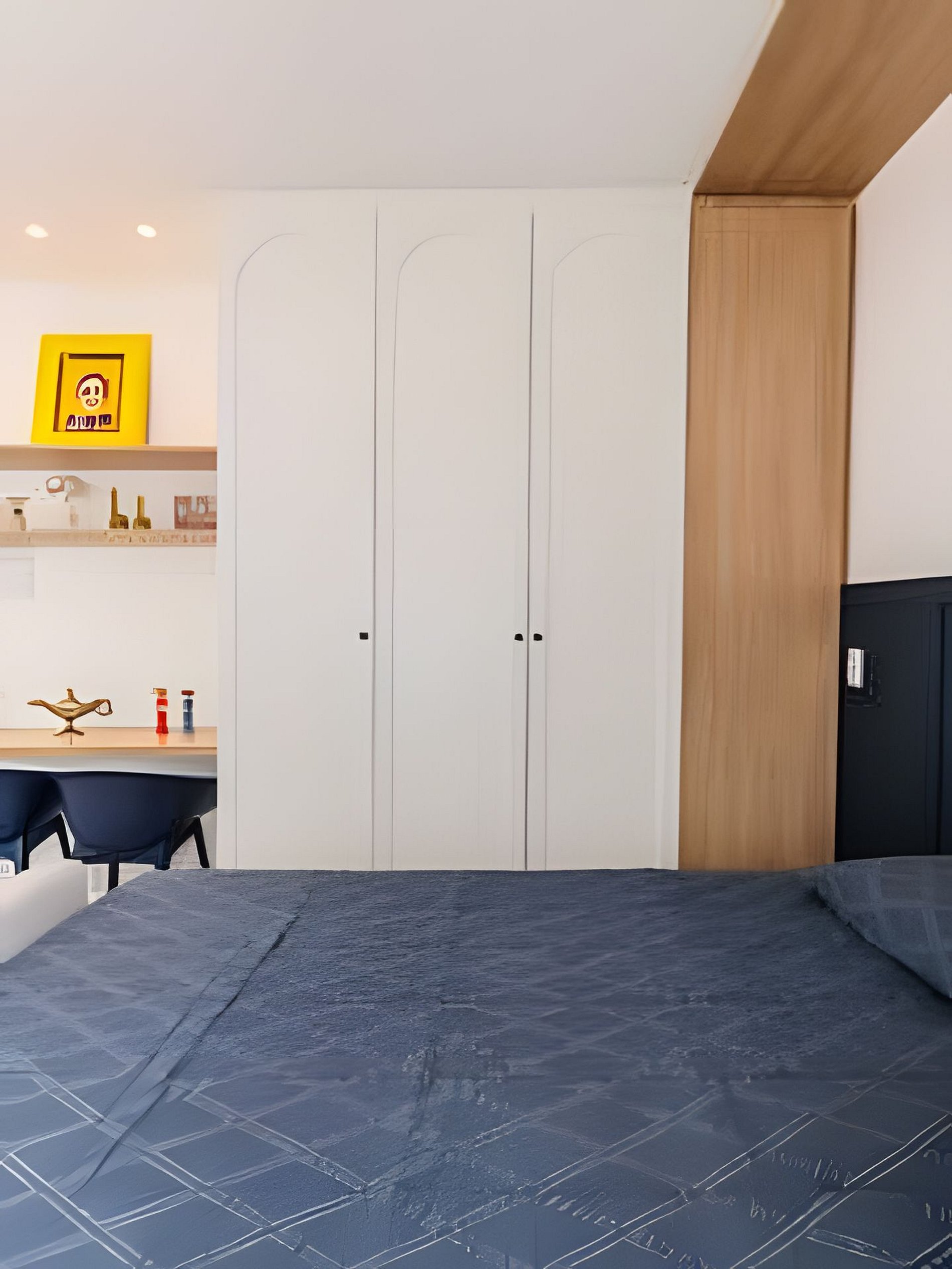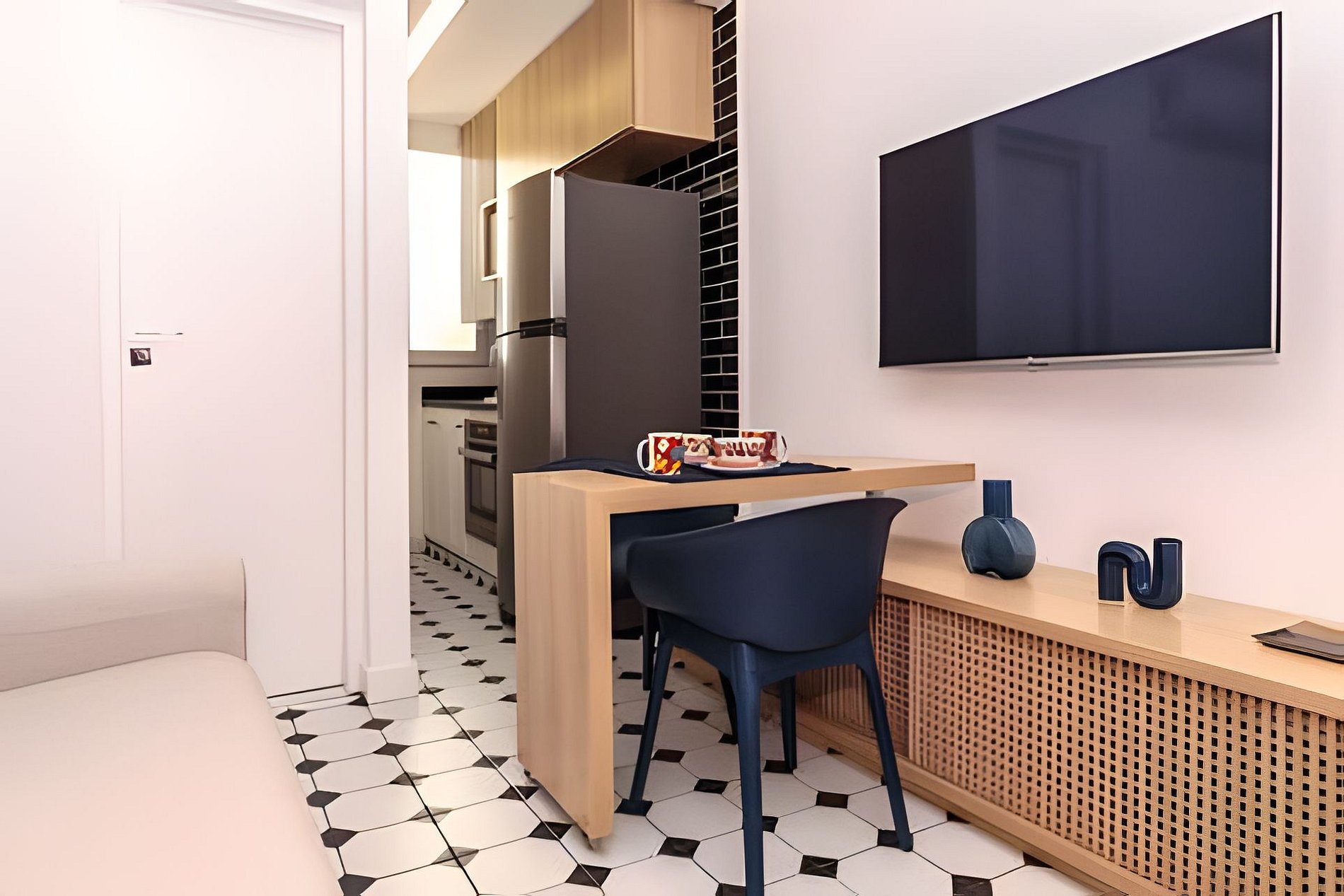 The bedroom consists of a king-size bed, wardrobe, and air conditioning and is interconnected with the living room, which features a comfortable sofa, home office station, smart Tv, and a dining table for 2 people.