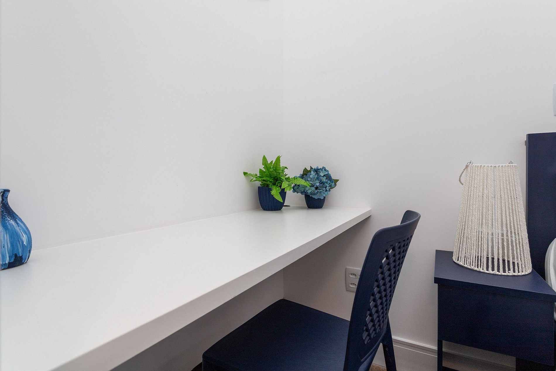 The bedroom has a queen-size bed, air conditioning, smart TV, closet, and home office space.