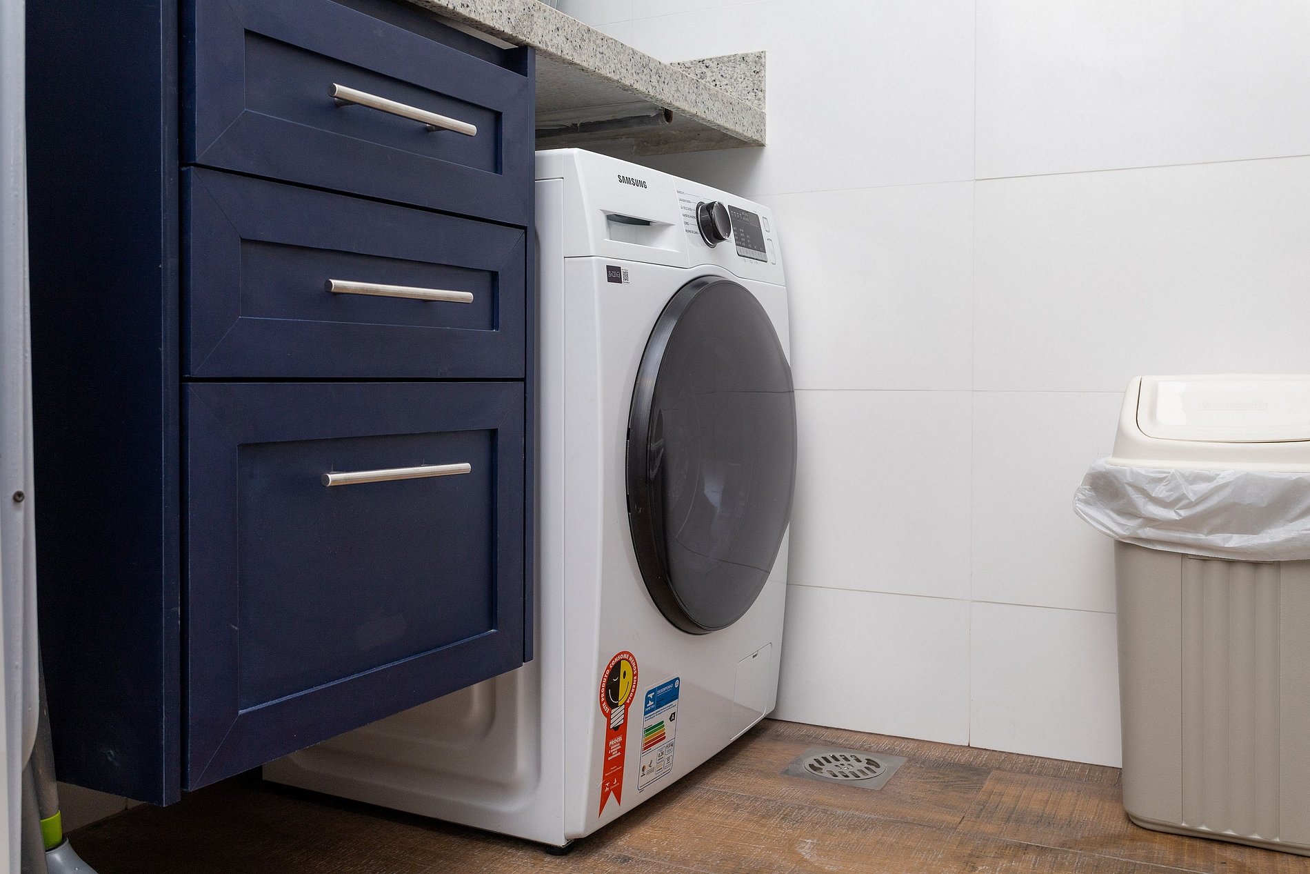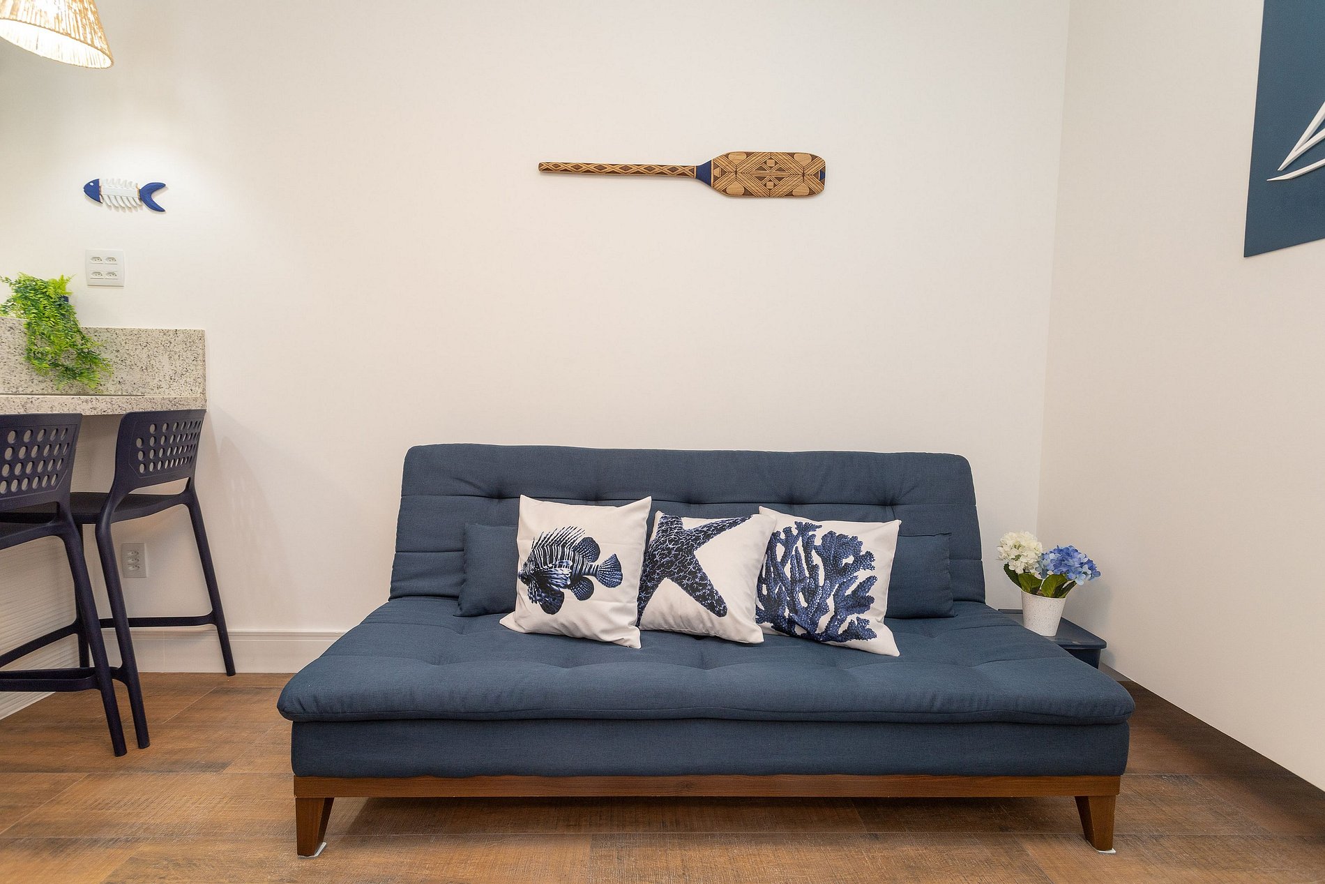The living room is equipped with a double sofa bed, ceiling fan, and smart TV, and is connected to the open kitchen, which is fully equipped with a refrigerator, oven, stove, microwave, coffee maker, air fryer, water filter, blender, and washer/dryer.