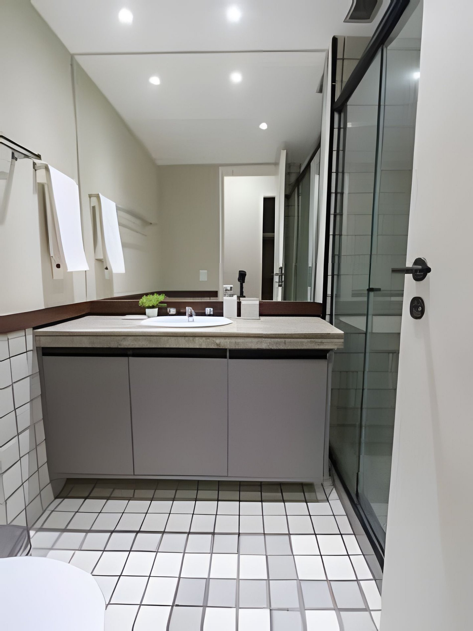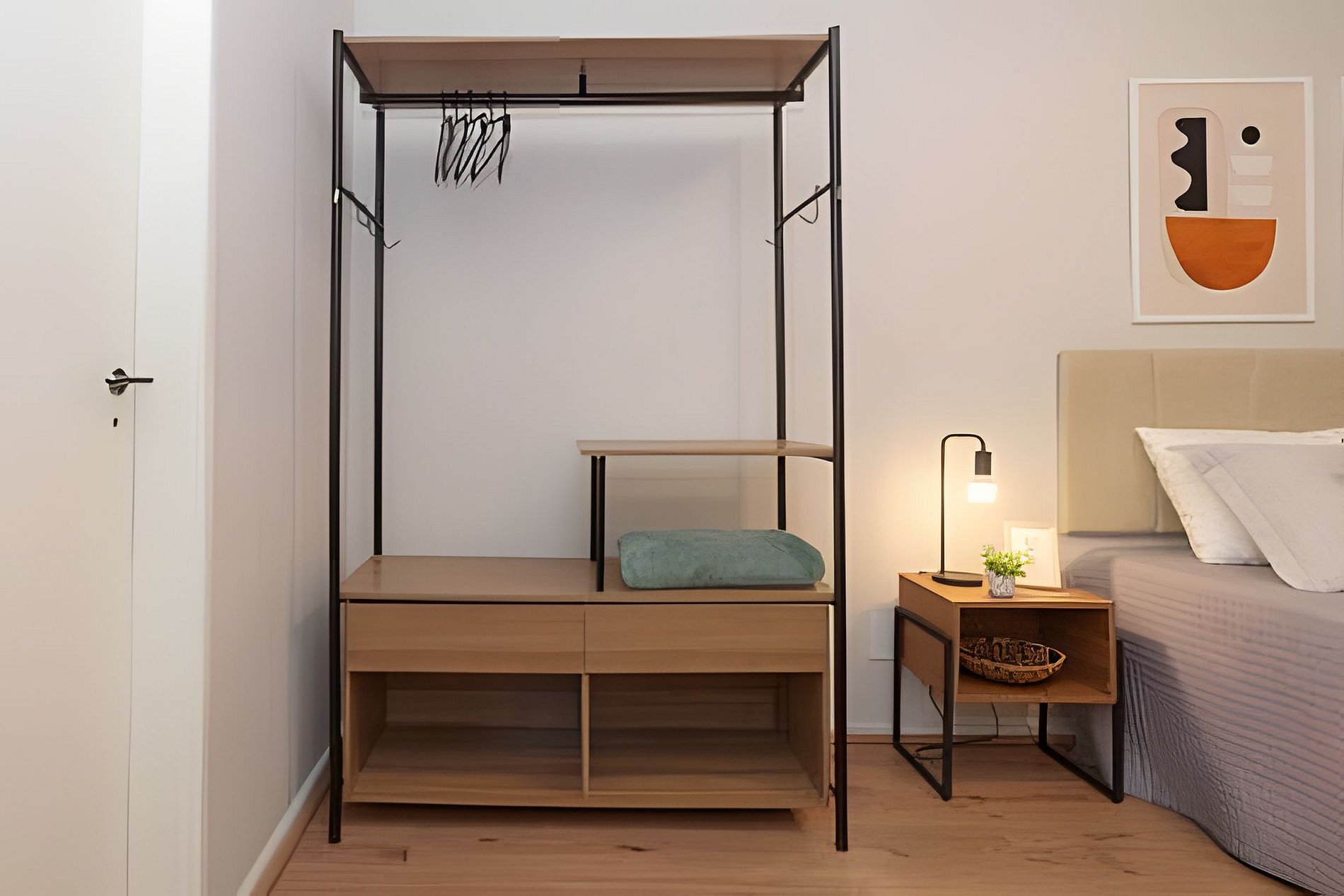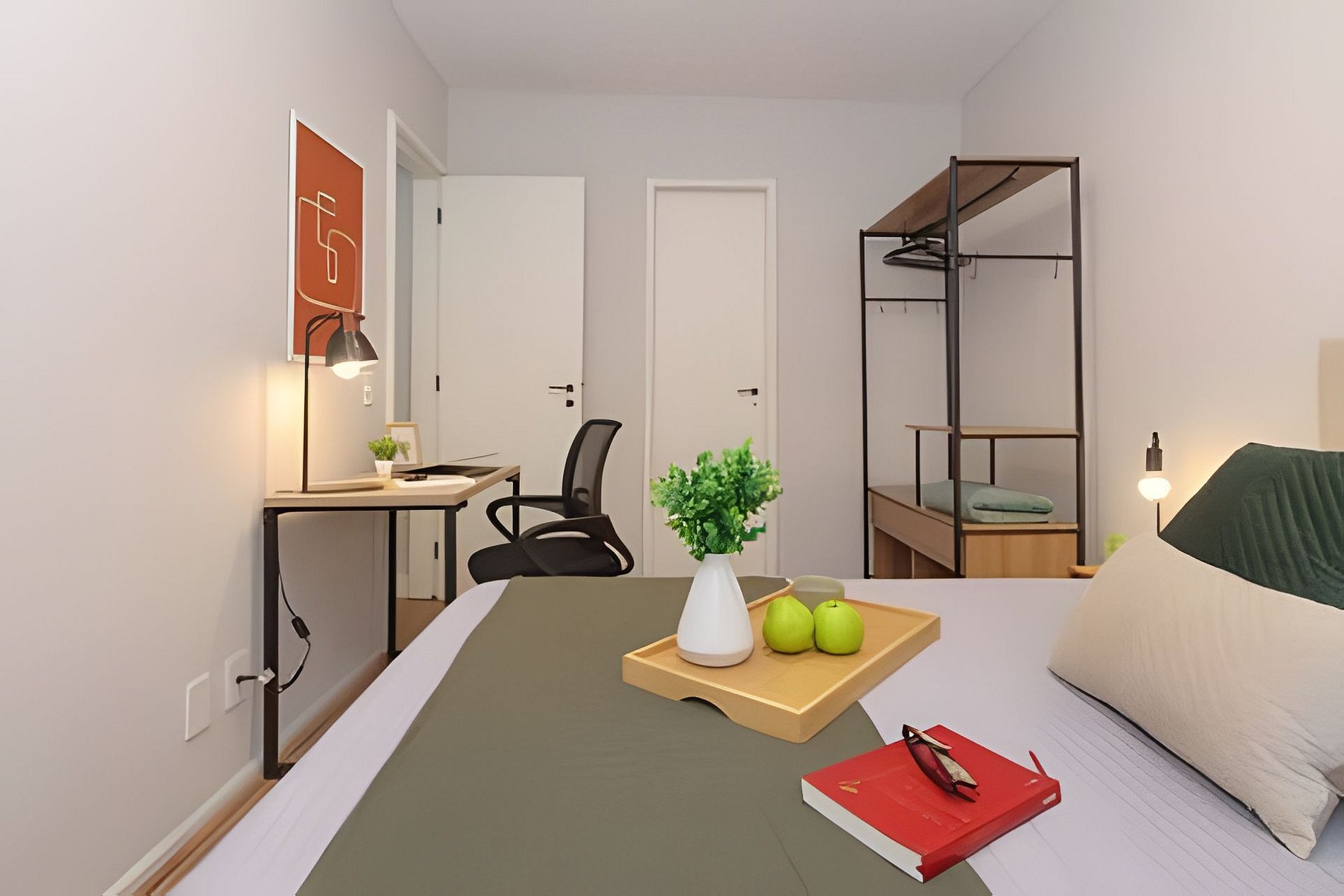 The main bedroom is a suite with a double bed for full rest, home office station, modular wardrobe, and air conditioning. The second bedroom has 2 single beds, modular wardrobe, and air conditioning.