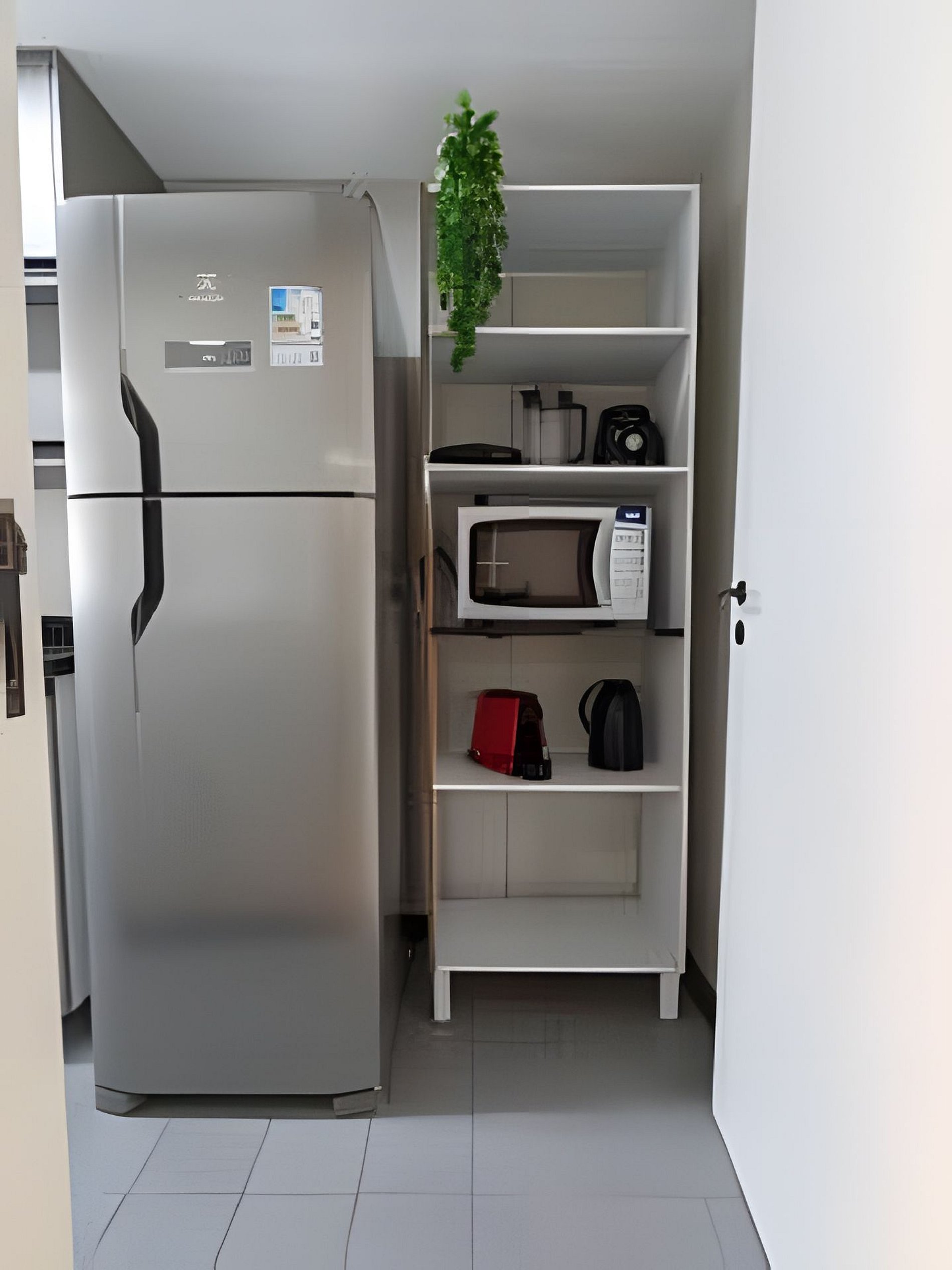 The kitchen is equipped with utensils and appliances, such as a stove, oven, refrigerator, microwave to facilitate food preparation. Attached to the kitchen is the small service area with a sink and a washing machine.