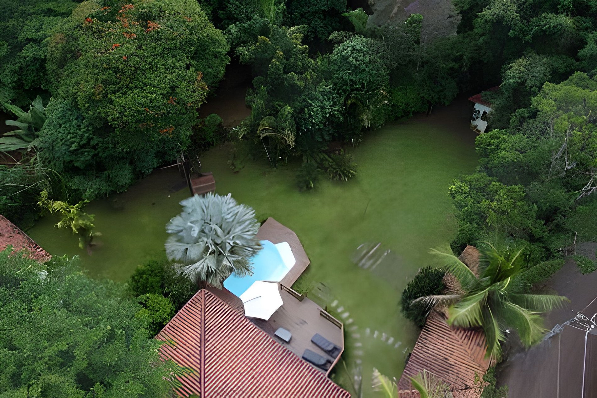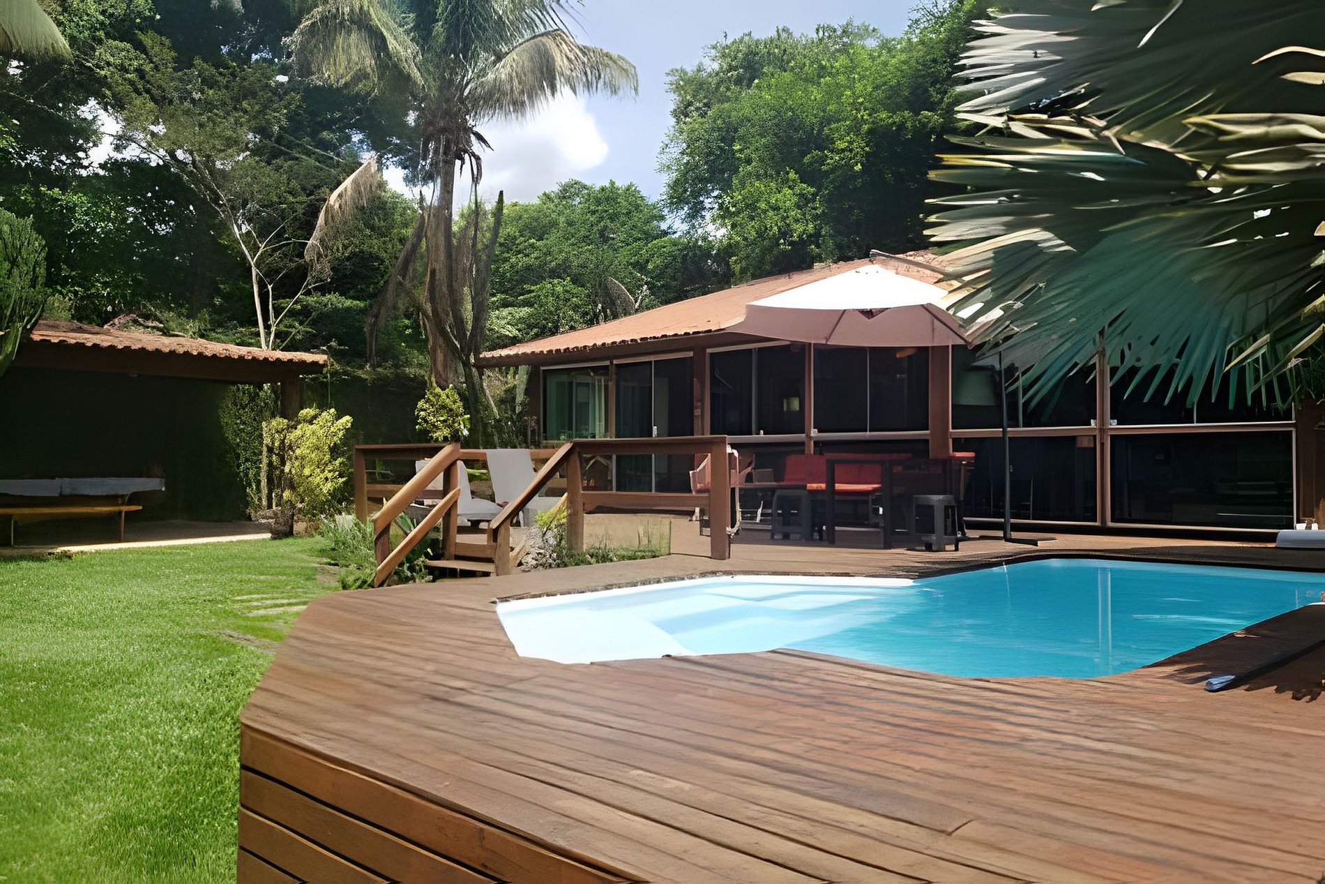 The land of the house is completely flat and bordered by the river, having a pool and treehouse, in addition to a wide lawn and a deck with two loungers, chairs and umbrella, shower and small shower for guest use.