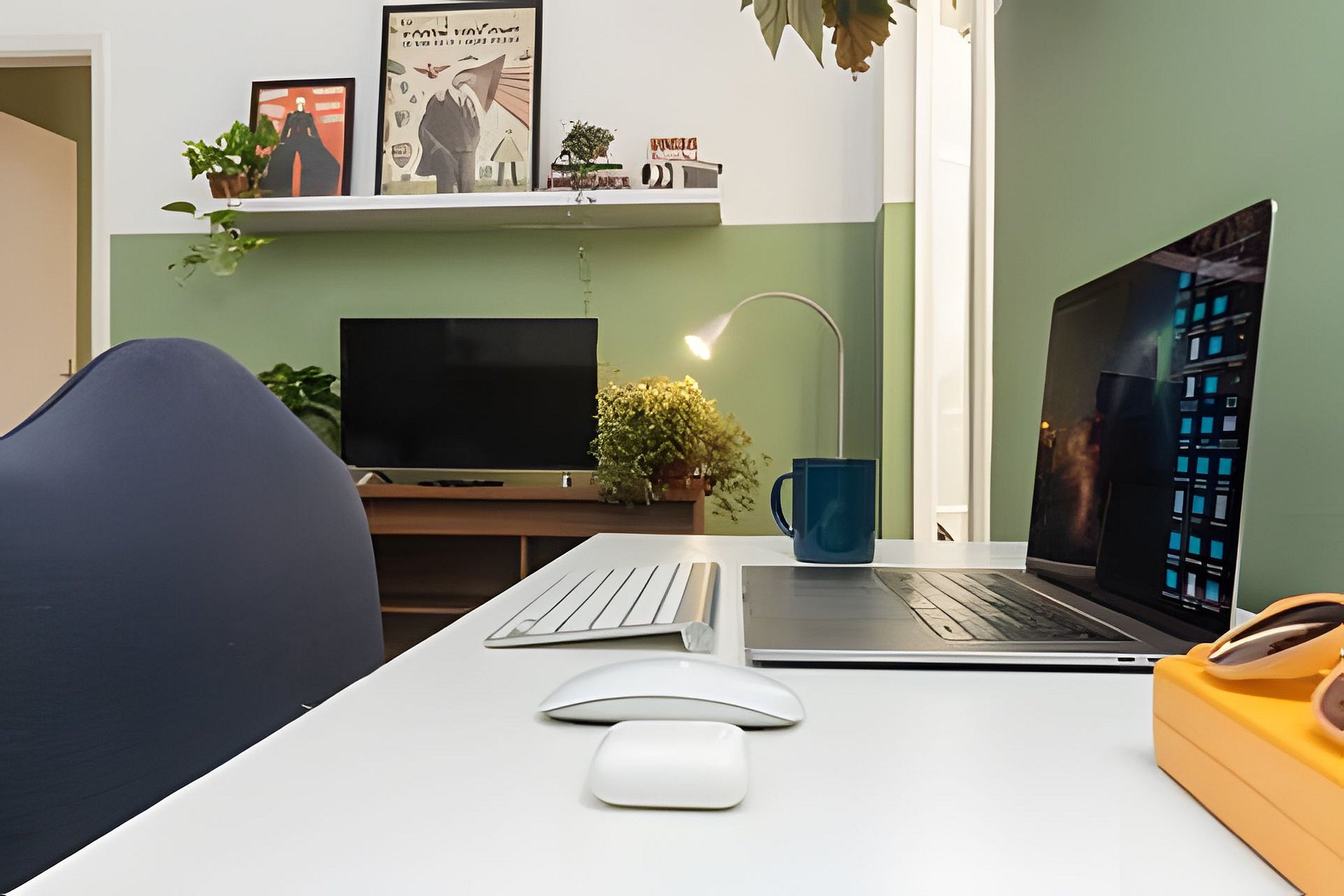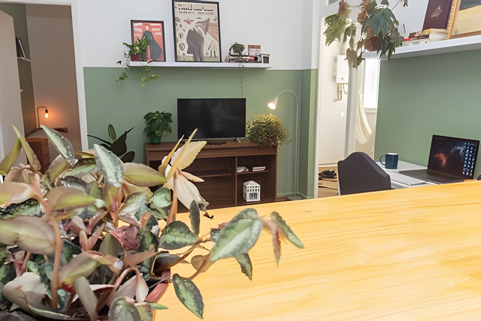 The apartment features a spacious living room with an internal balcony with a cozy environment, a sofa bed that accommodates one person to sleep, Tv, 1 table and 1 chair and plants and home office space for your convenience.