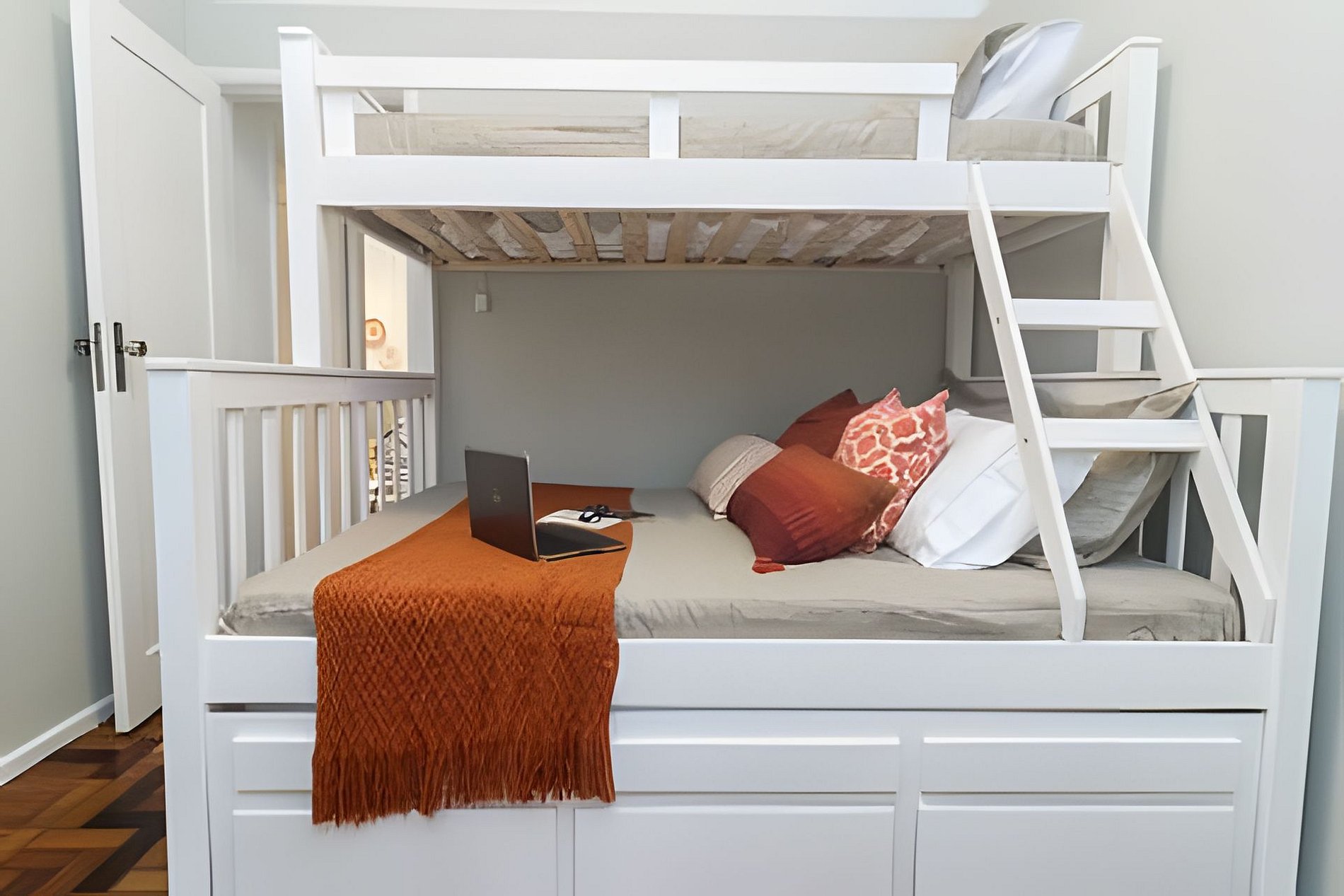 The apartment accommodates groups of up to 5 people and offers guests Wi-Fi, Amazon Prime on TV, air conditioning, and 2 bedrooms. The first bedroom accommodates 4 guests in a bunk bed, the second bedroom has a double bed accommodating 2 guests, and for the seventh person we provide a single mattress. The apartment also has a guest bathroom and, in addition, a living room, kitchen, and laundry area with a washing machine, sink, clothesline, and a service bathroom.