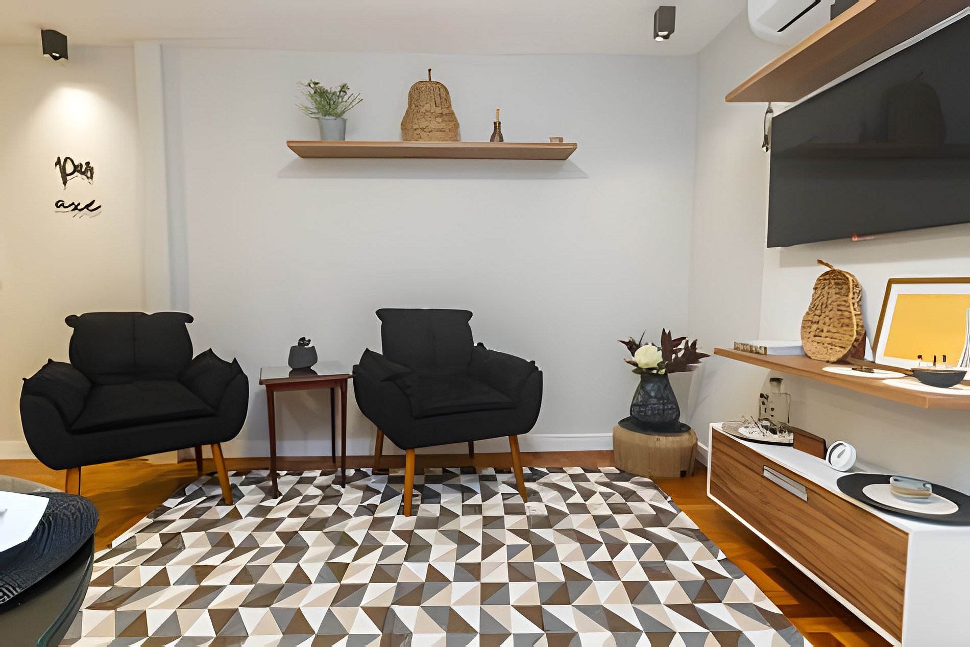 This 51 m2 apartment has one bedroom, one bathroom, a kitchen, and a living room. In the living room, it is possible to relax on a comfortable sofa while watching television, and there is air conditioning in the environment.