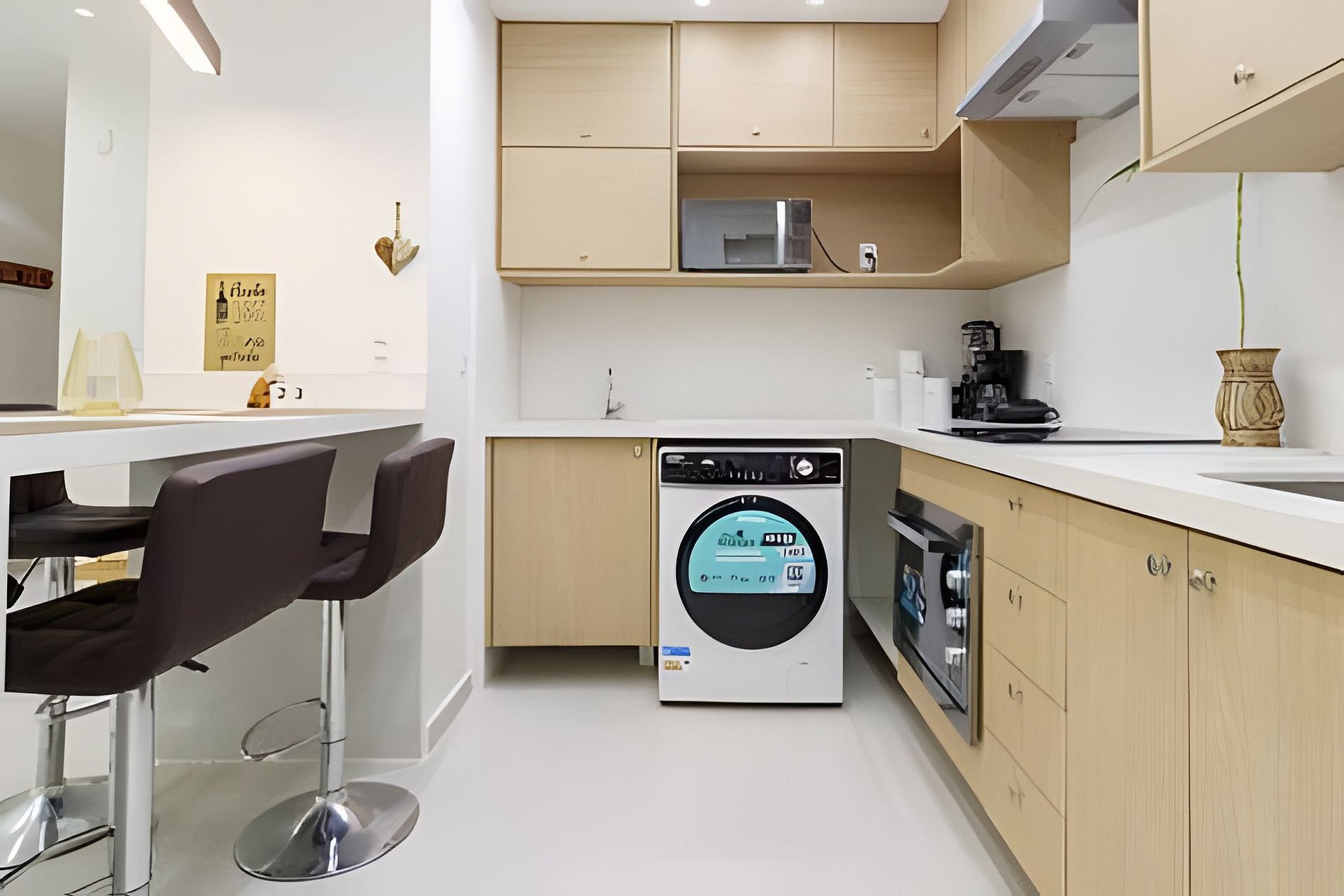 The living room is a welcoming space and features a 55-inch smart Tv, perfect for leisure moments and is integrated with a fully equipped American kitchen with washer and dryer, refrigerator, cooktop stove, electric oven, microwave, and all necessary kitchen utensils to easily prepare your meals. For your convenience, we also provide an iron and ironing board, as well as a floor clothesline.