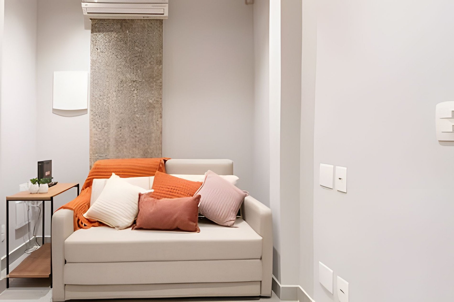 The living room is spacious and cozy, offering a sofa bed, Smart Tv and a home office cabinet, perfect for those who need to work remotely.