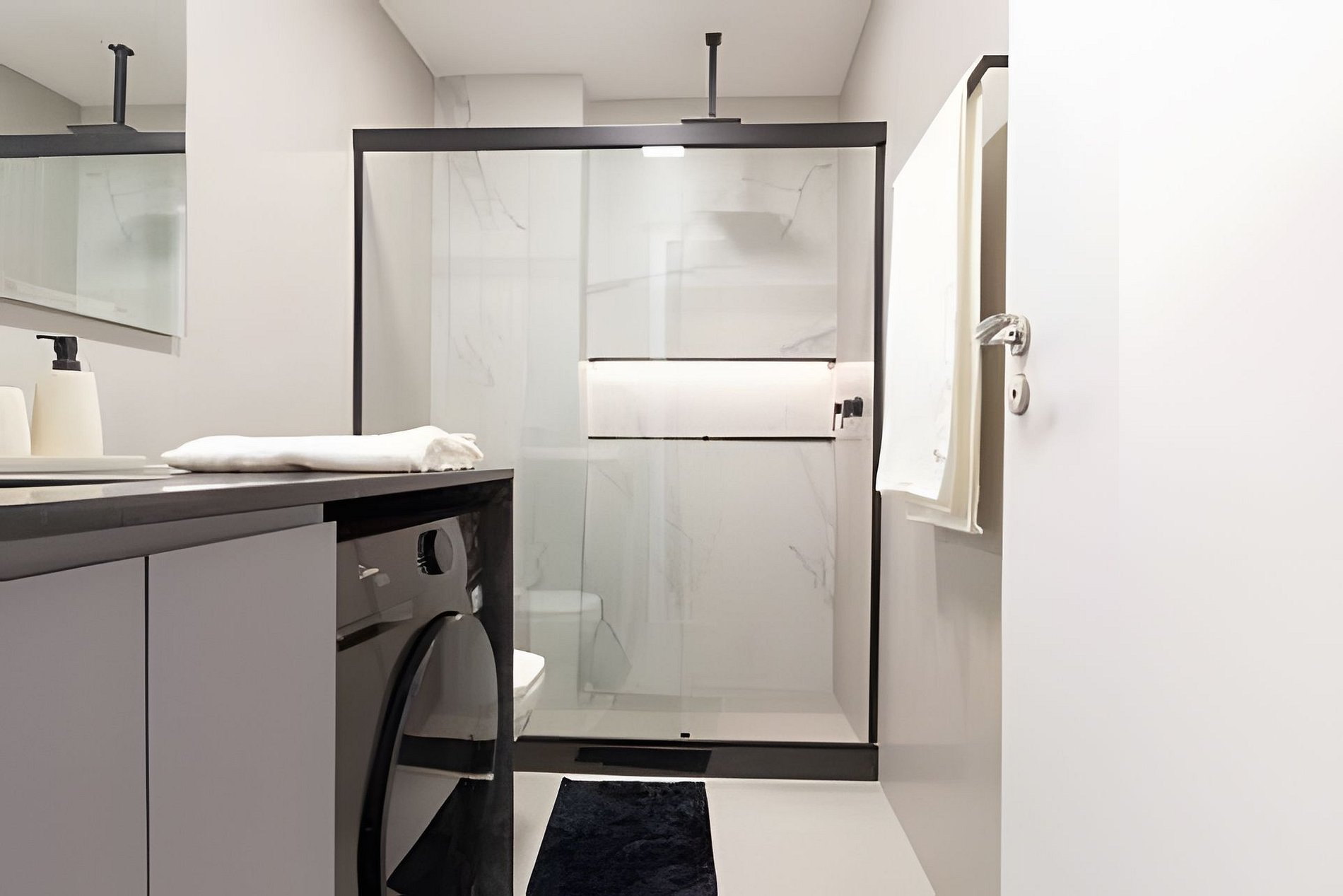 The bathroom is modern and functional, equipped with a washer and dryer and an excellent shower for your comfort.