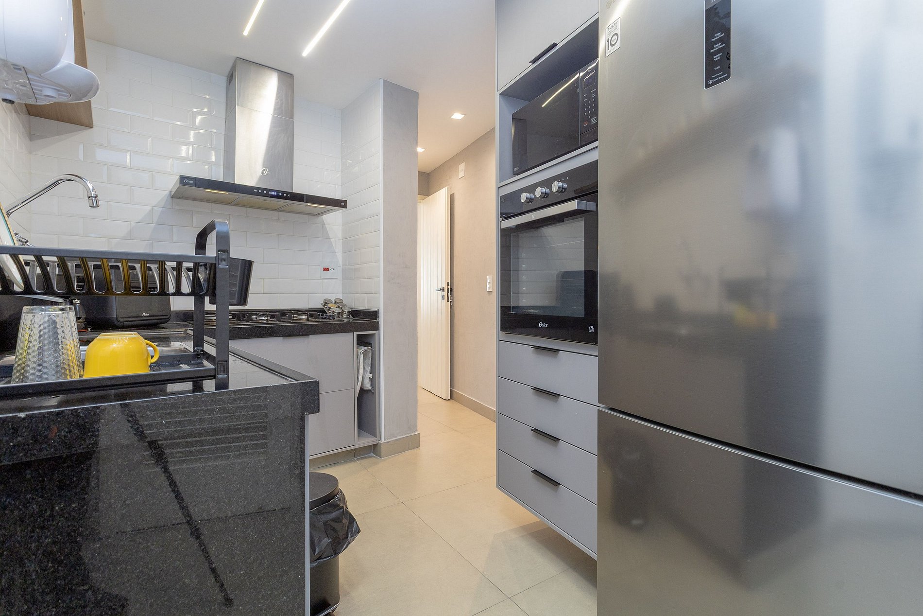 The kitchen is well equipped with an inverse refrigerator, microwave, electric oven, owen air fryer, cook top, hood, and all household appliances for everyday use.