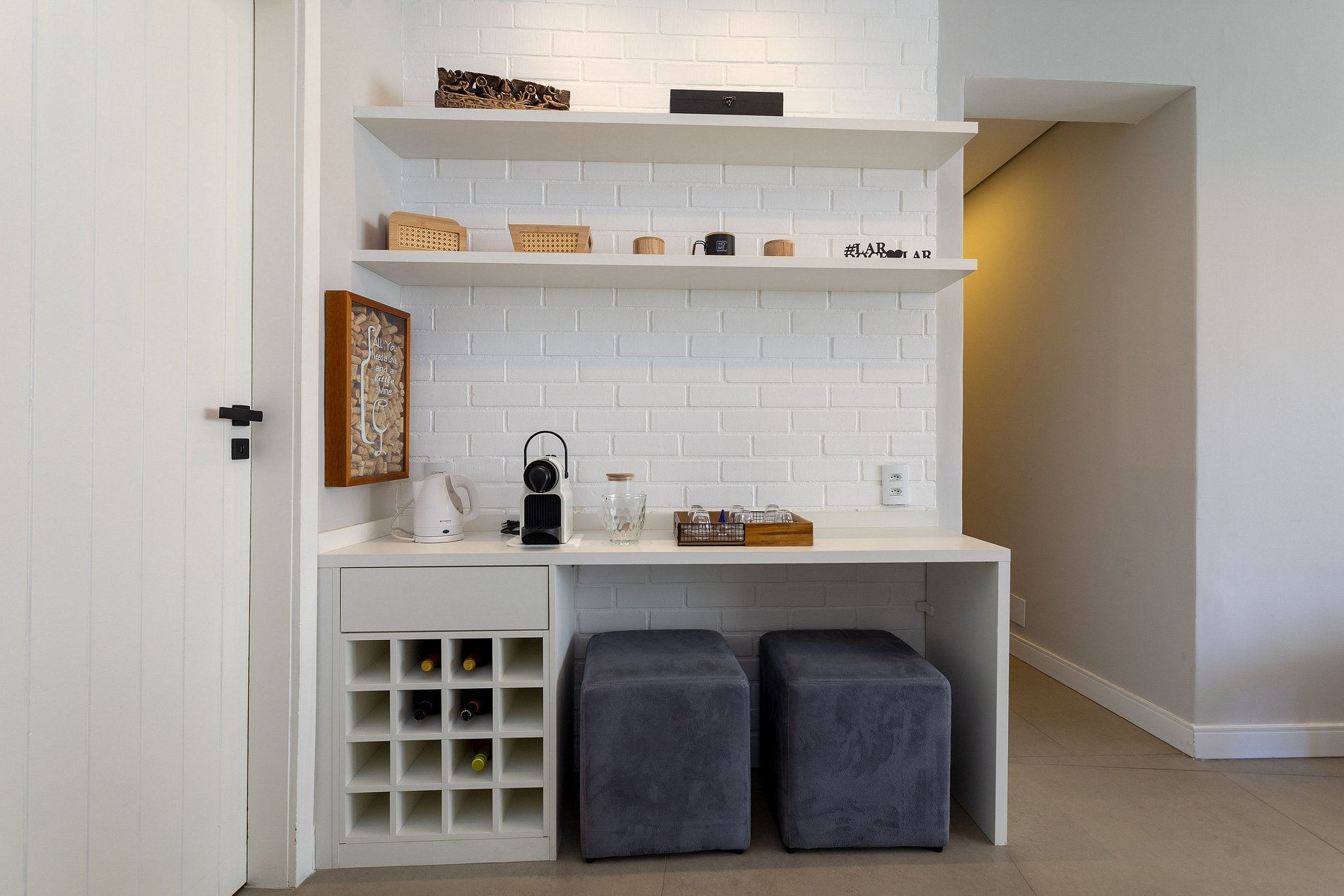 The living room has 1 sofa, 1 armchair, dining area with a table, 4 chairs, coffee counter with two seats, Nespresso coffee maker, electric kettle, dry cellar and 65-inch smart TV.