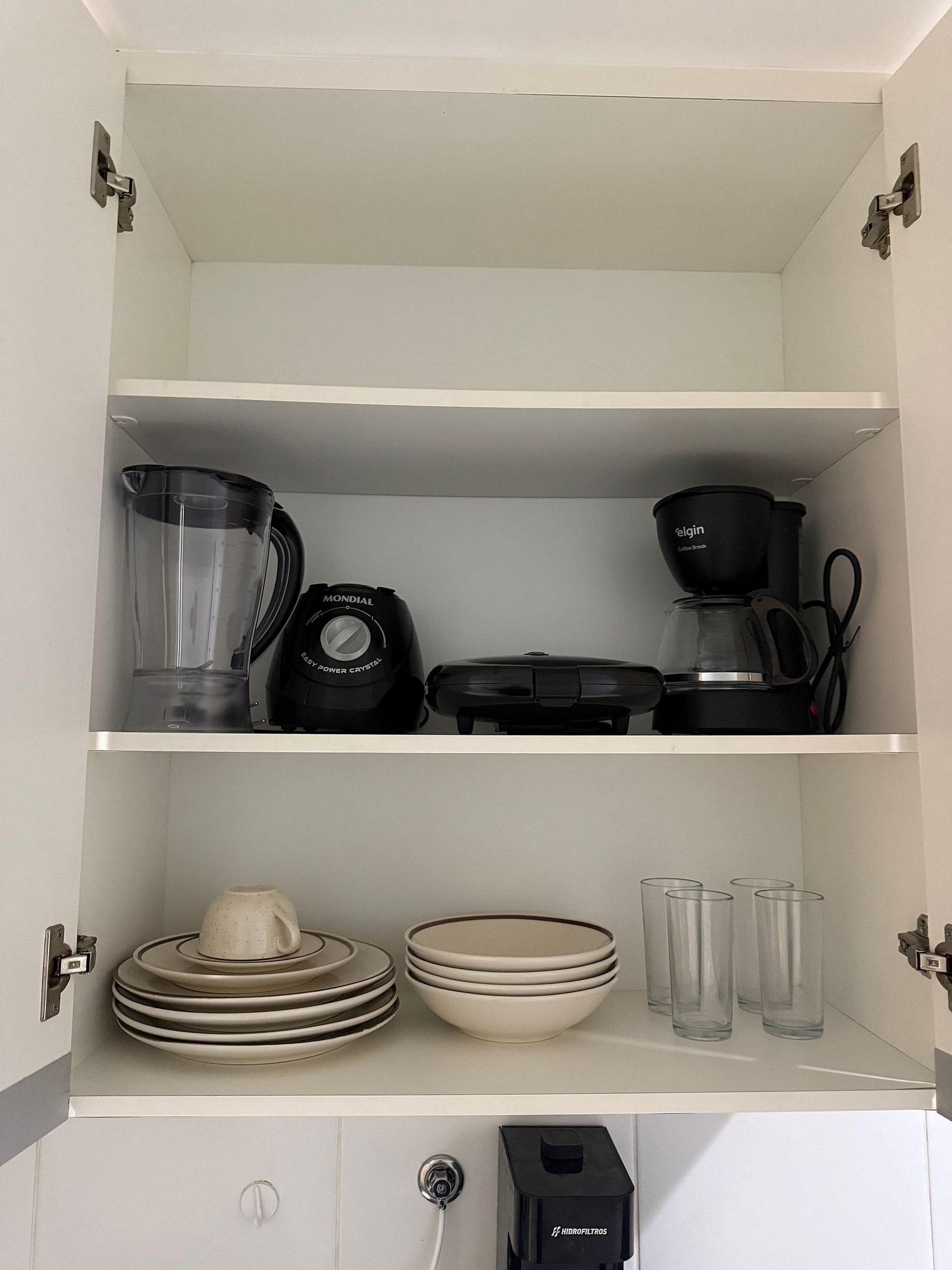 Kitchen: Stove, oven, refrigerator, microwave, toaster, blender, coffee maker, dishes, cutlery, and glasses.
