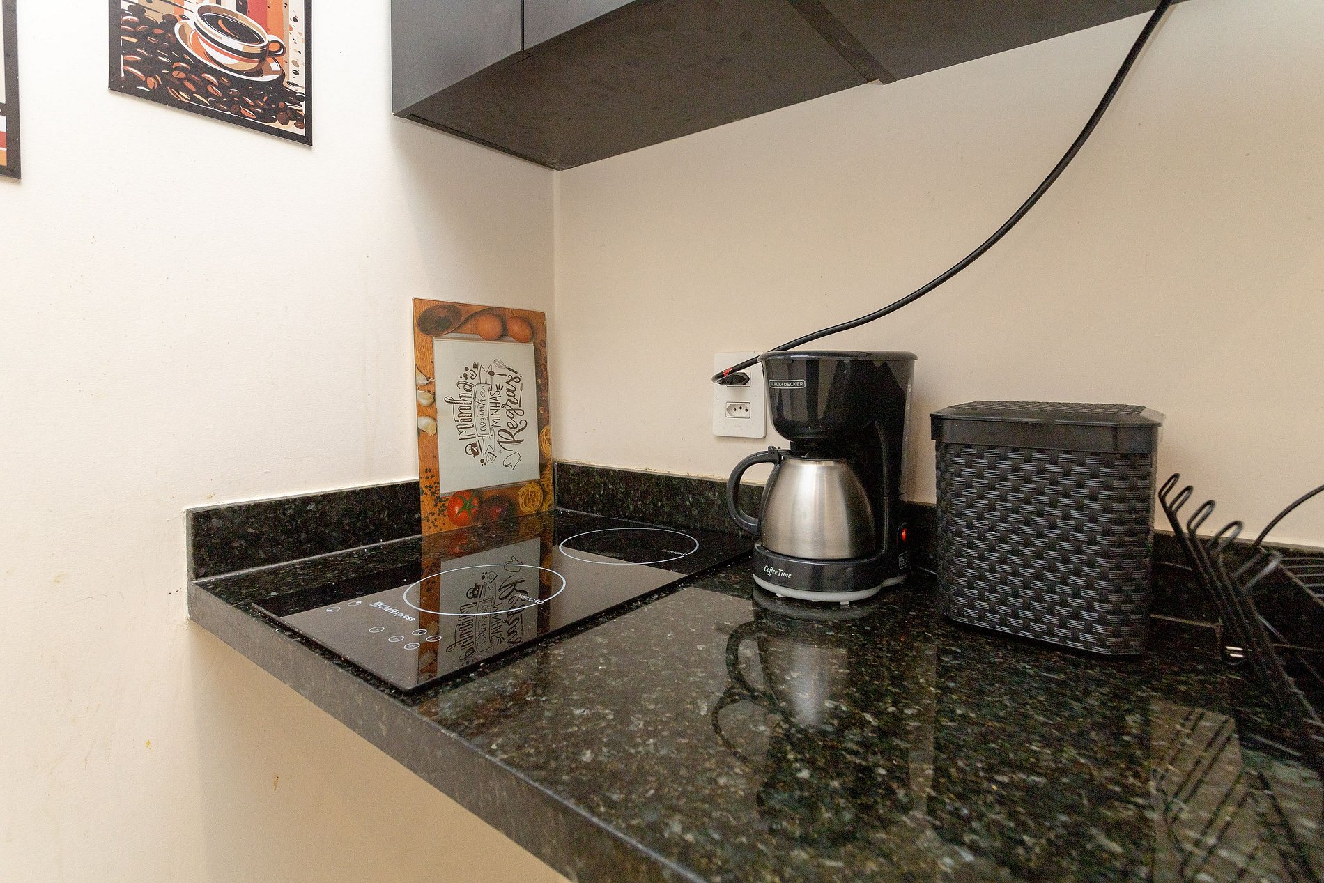 Kitchen: Cooktop, refrigerator, coffee maker, microwave, cutlery, and kitchen utensils.