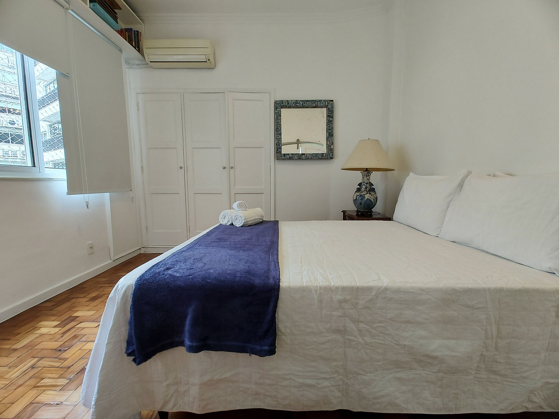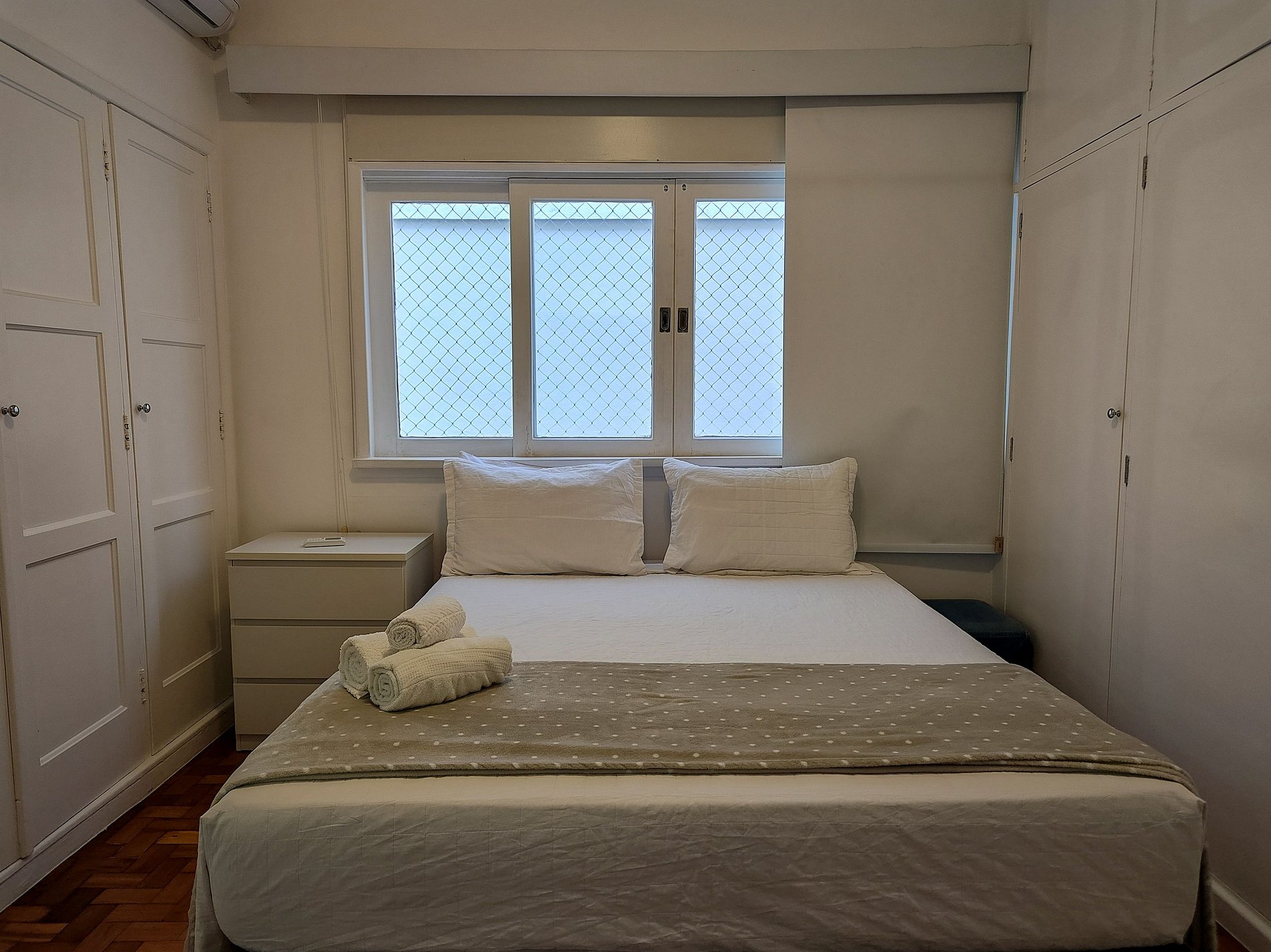 Bedroom 2: One double bed, closets, air conditioning, blackout curtains, and a full bathroom.