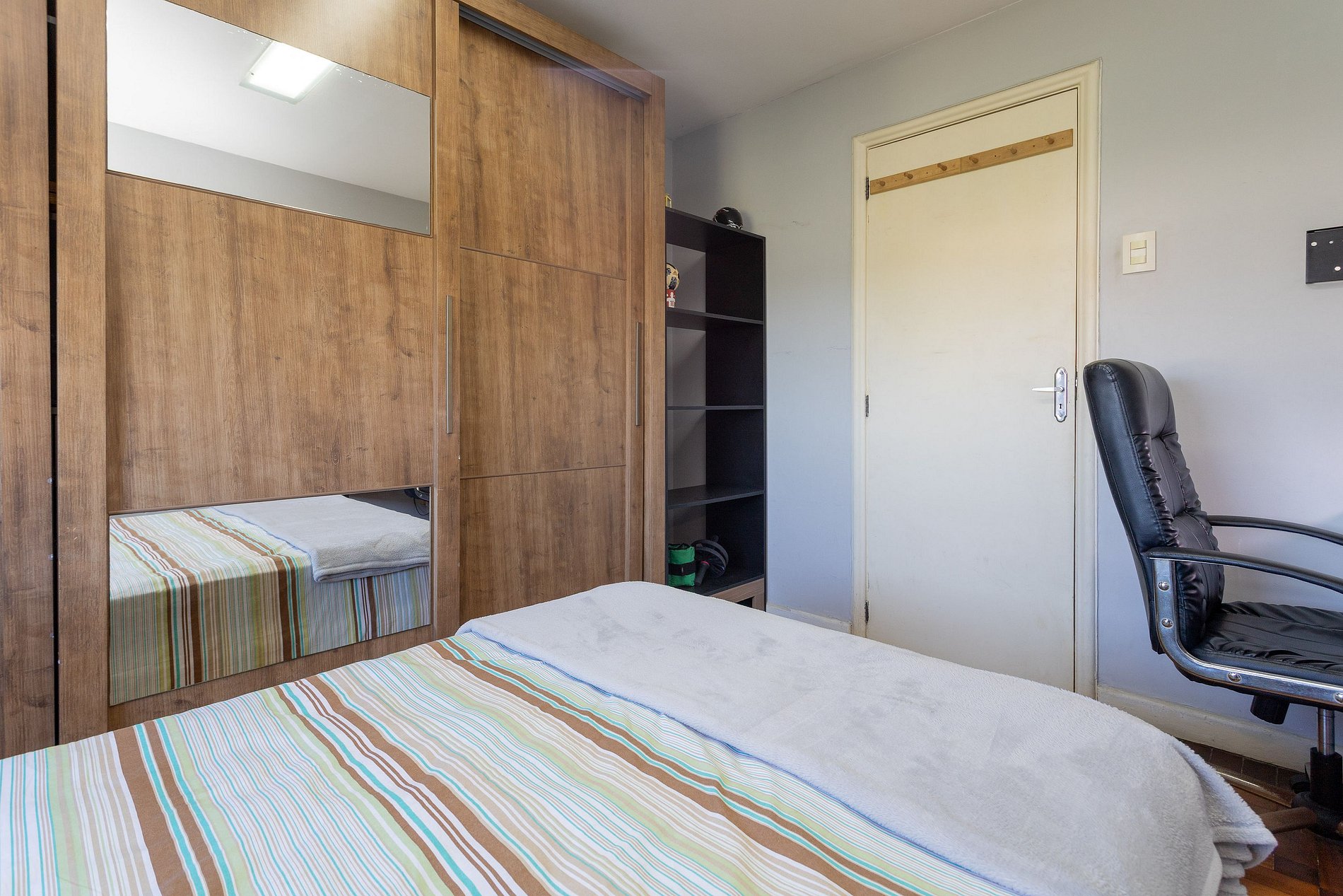 Bedroom 2: Single bed, closet, air conditioning, home office space, and mini-fridge.