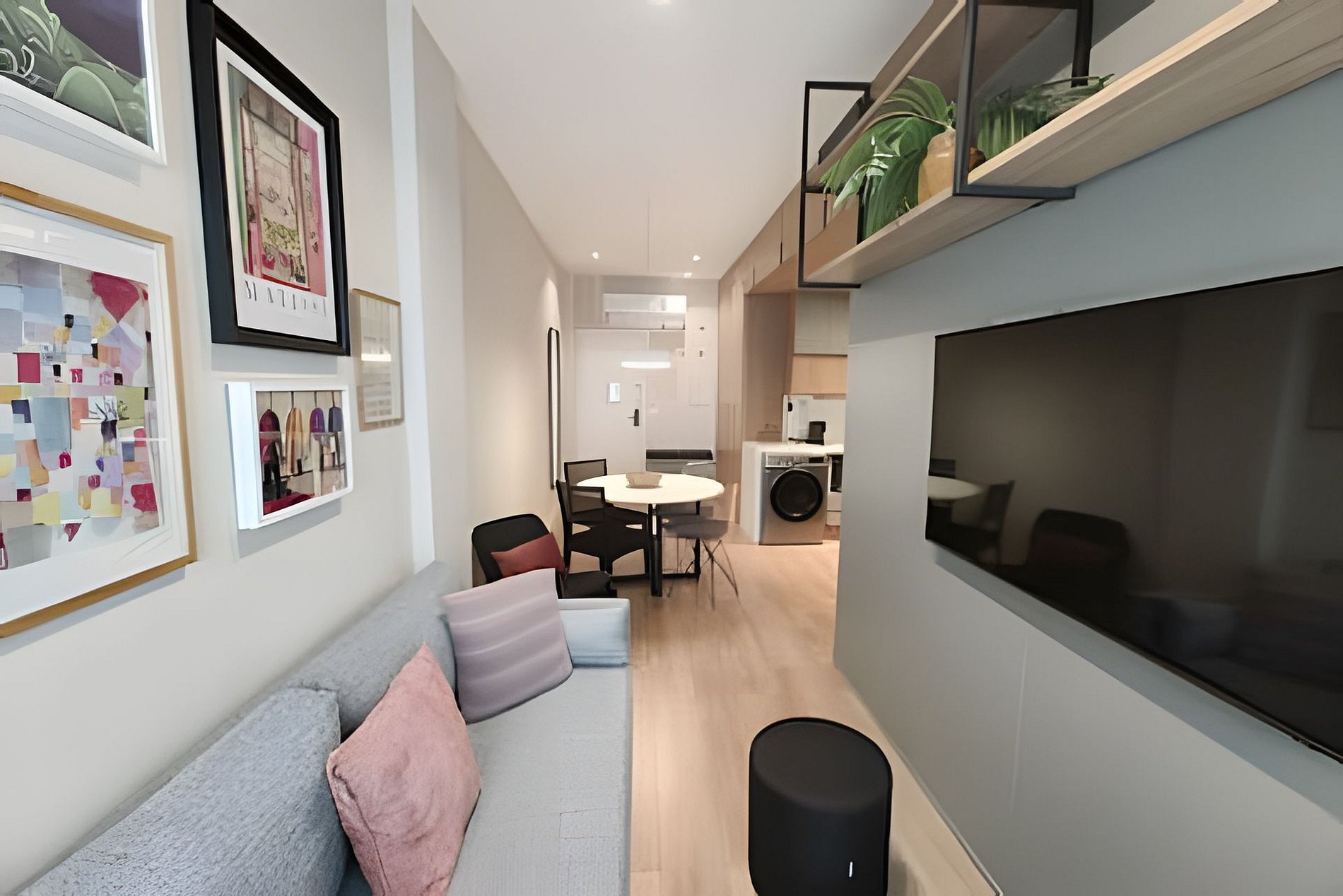La sala de estar, además de acogedora, cuenta con un smart TV, un sofá cama doble y una mesa de comedor, lo que la hace perfecta para relajarse después de un día explorando la ciudad. La cocina es un sueño para los amantes de la cocina, totalmente equipada con refrigerador, microondas, estufa, tostadora y cafetera de cápsulas, además de todos los utensilios necesarios.