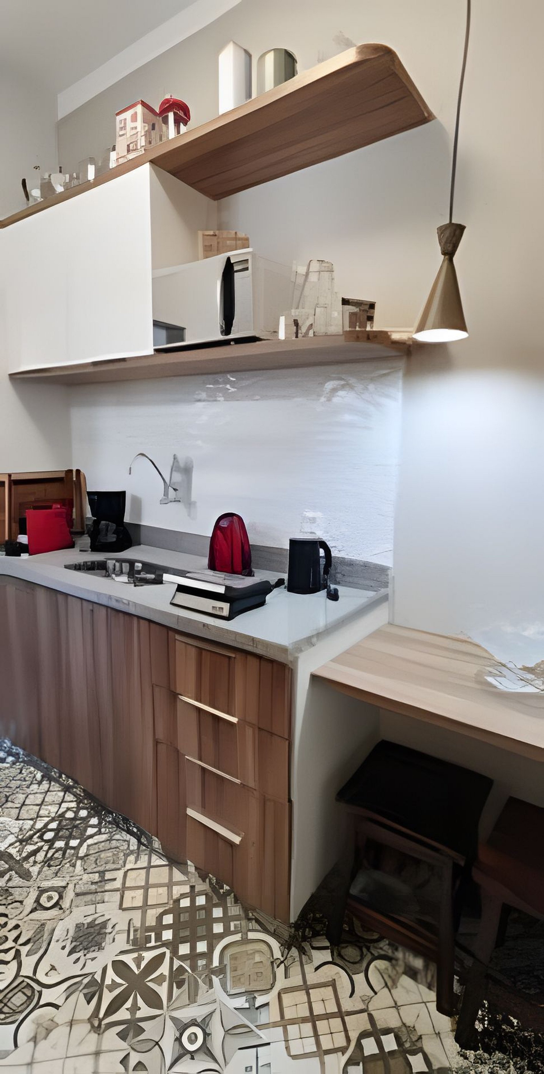La cocina es completa y está equipada con nevera, microondas, horno, placa de cocina de 4 fuegos, cafetera de cápsulas, sandwichera, diversos utensilios, ofreciendo toda la estructura necesaria para preparar comidas en el propio apartamento con comodidad. El área de servicio anexa a la cocina, cuenta con una lavadora y un tendedero de techo.