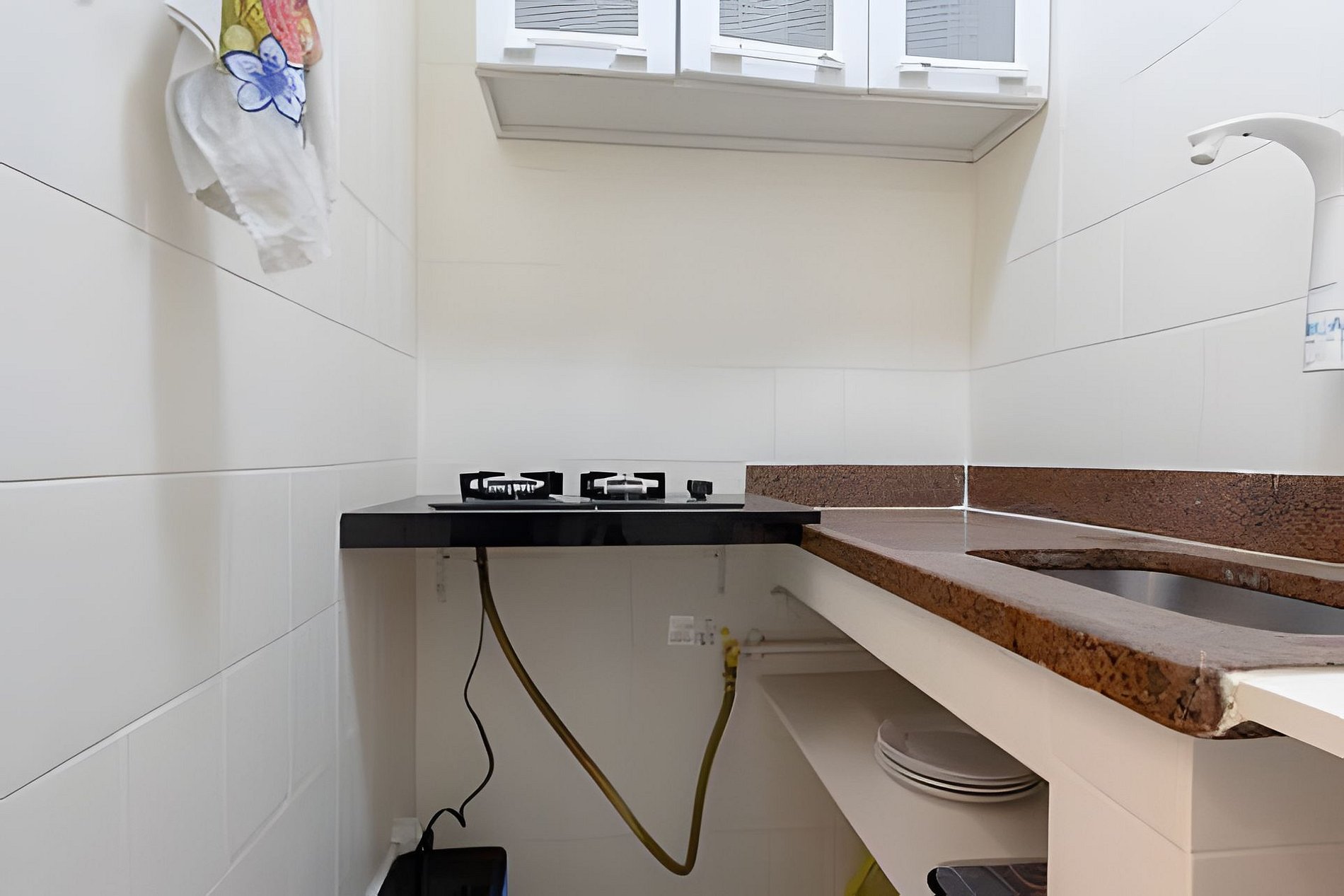 El apartamento cuenta con una habitación con una cama queen, aire acondicionado y smart tv que está integrada a la sala. La cocina viene equipada con minibar, microondas, cocina de gas, sandwichera y utensilios y cubiertos.
