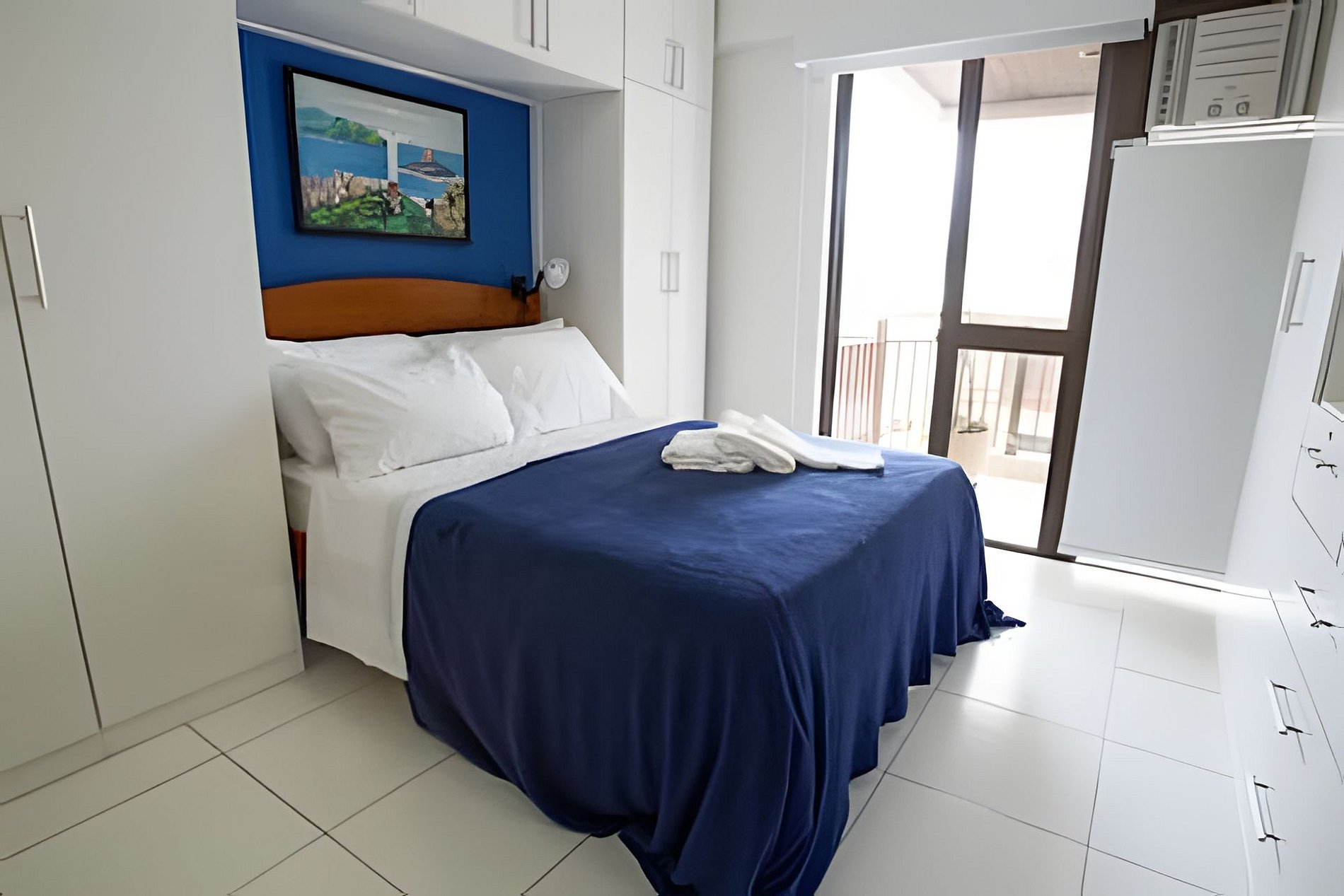 El apartamento cuenta con habitación con cómoda cama de matrimonio, aire acondicionado y armario empotrado. La sala de estar está equipada con Tv por cable, mesa de comedor y Wi-Fi. La cocina posee utensilios básicos, como: cocina, microondas, horno, refrigerador y cafetera. El área de servicios contiene lavadora. Proporcionamos a los huéspedes ropa de cama y toallas.