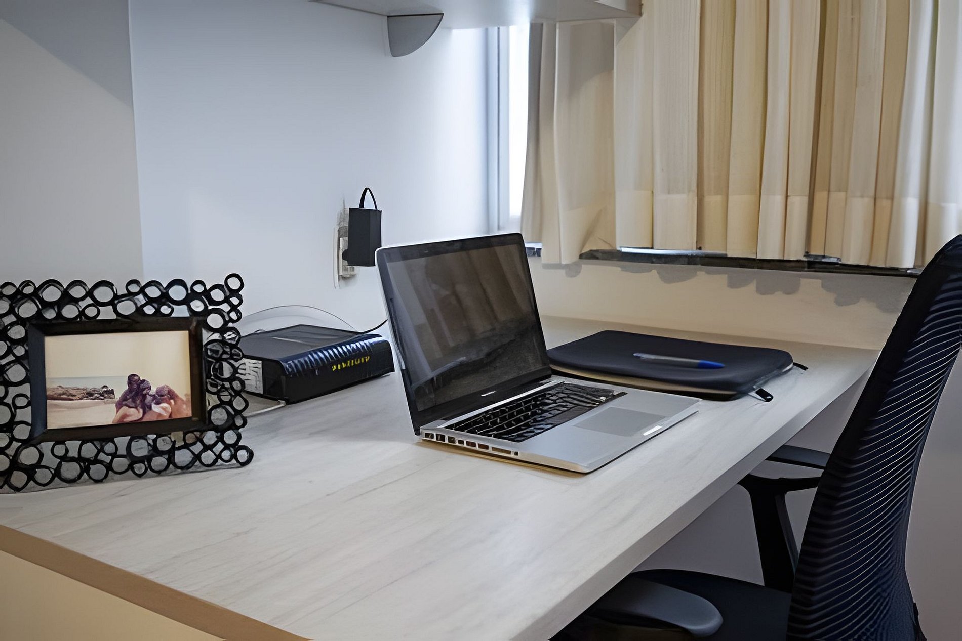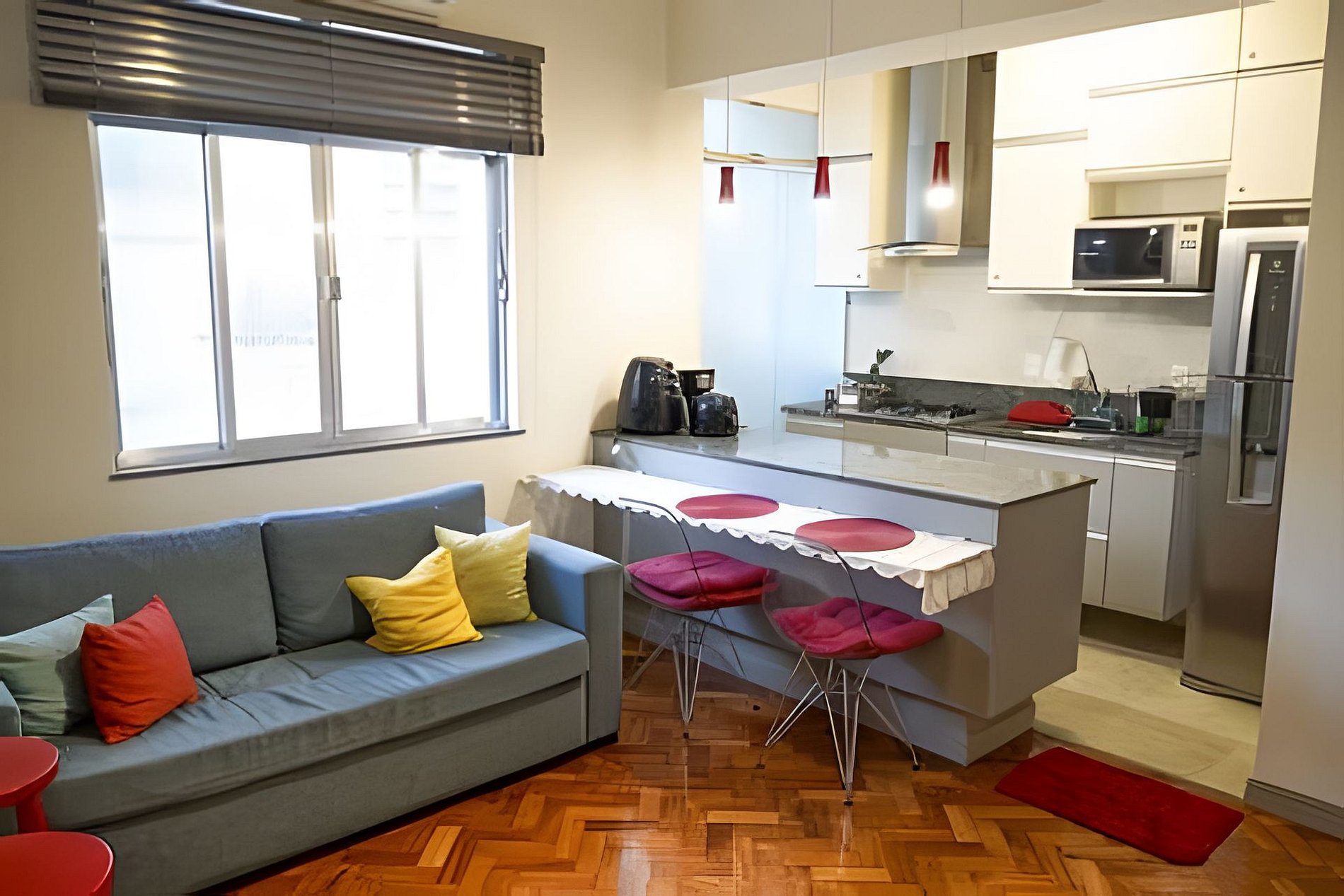 El apartamento tiene muchas ventanas, siendo una de la habitación y una de la sala grandes, lo que hace que sea muy ventilado e iluminado. En la suite los muebles son planificados, con mesa de home office/estudio y un armario amplio, posee dos camas con otras dos retráctiles/articulables debajo que quedan a la misma altura de una cama normal, posee ropa de cama y baño y televisión en la habitación.