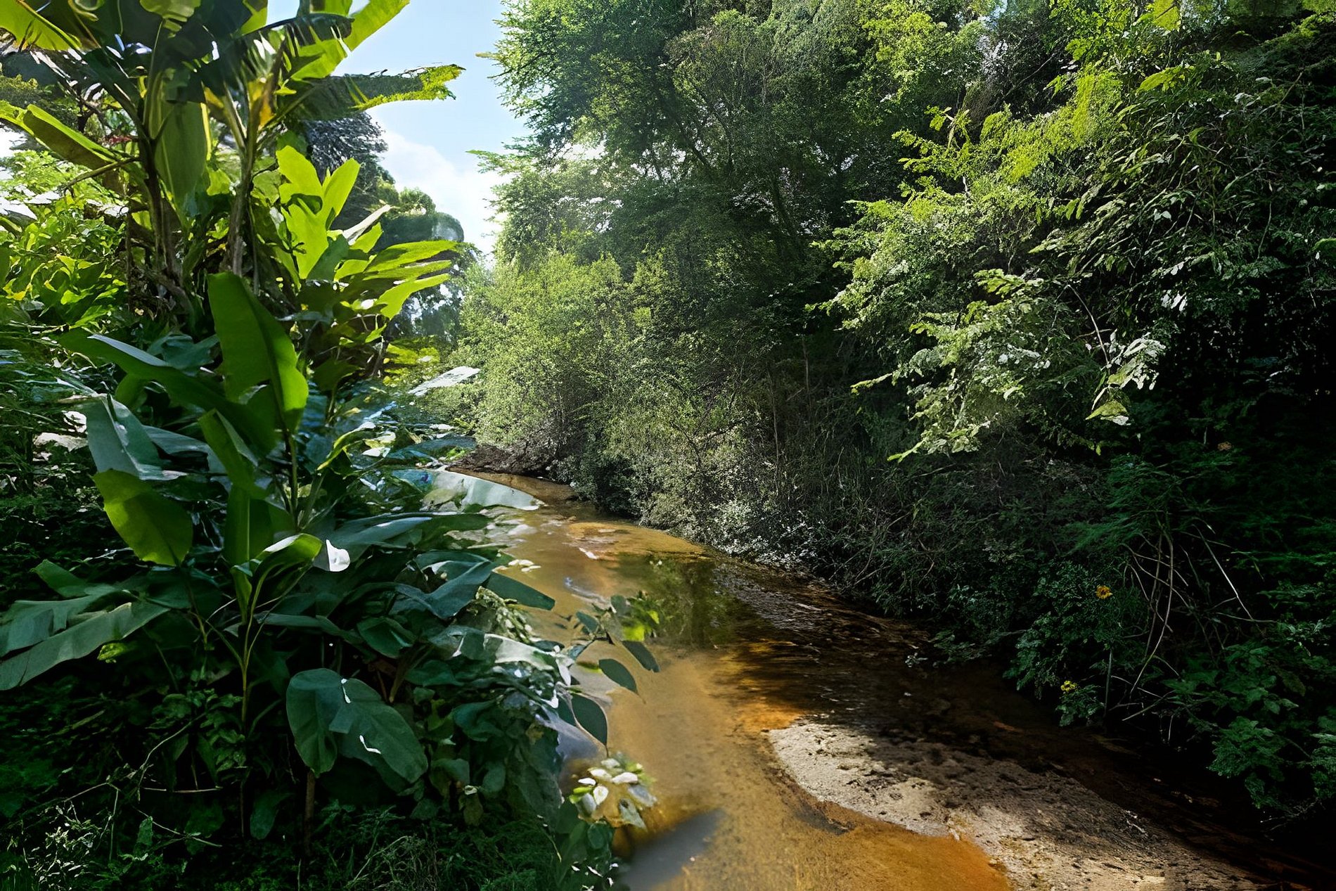 El terreno de la casa es completamente plano y bordeado por el río, teniendo piscina y casita en el árbol, además de un amplio césped y una terraza con dos tumbonas, sillas y sombrilla, ducha y regadera para uso de los huéspedes.