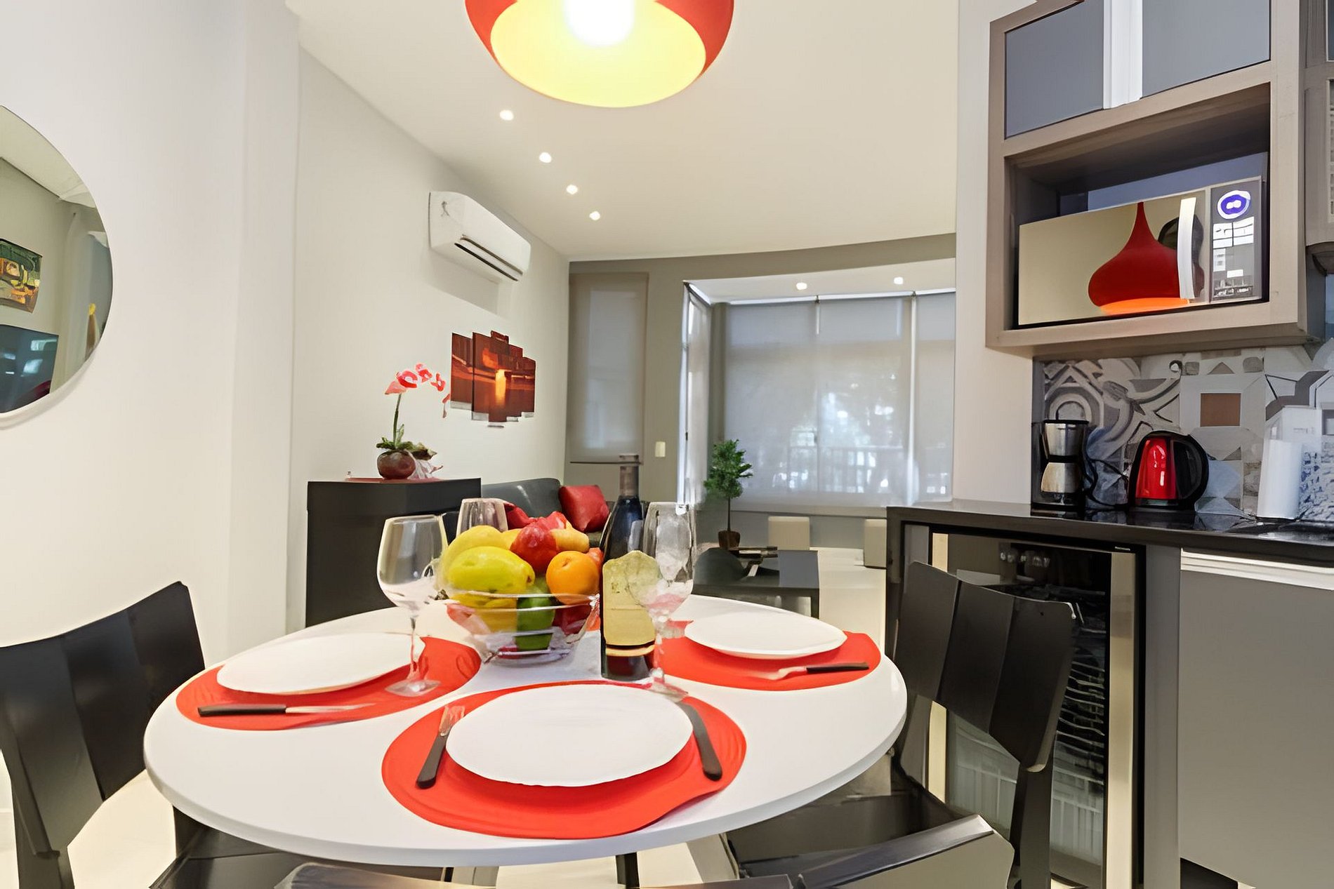 El apartamento cuenta con una sala de estar iluminada con sofá, aire acondicionado y televisión. La cocina está decorada con mesa y sillas perfecta para las comidas y está equipada con diversos utensilios y electrodomésticos, como microondas, refrigerador, cocina y horno.