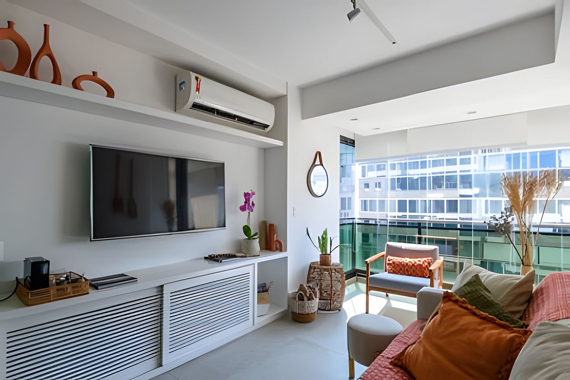Al entrar en el alojamiento serás recibido con una atmósfera de buen gusto y confort. La sala de estar, integrada a la cocina, cuenta con sofá, smart tv, aire acondicionado split y ofrece un ambiente acogedor para relajar y disfrutar de momentos especiales.