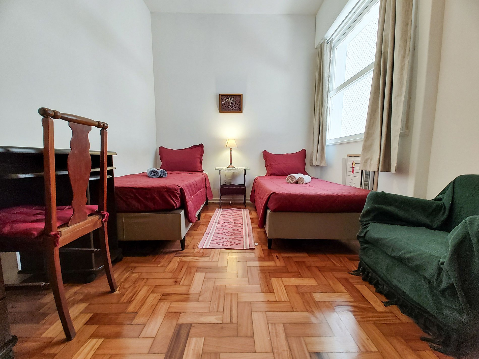 Habitación 2: dos camas individuales, lámpara de pie, armarios, mesa para computadora portátil, un sillón, aire acondicionado y cortinas opacas.