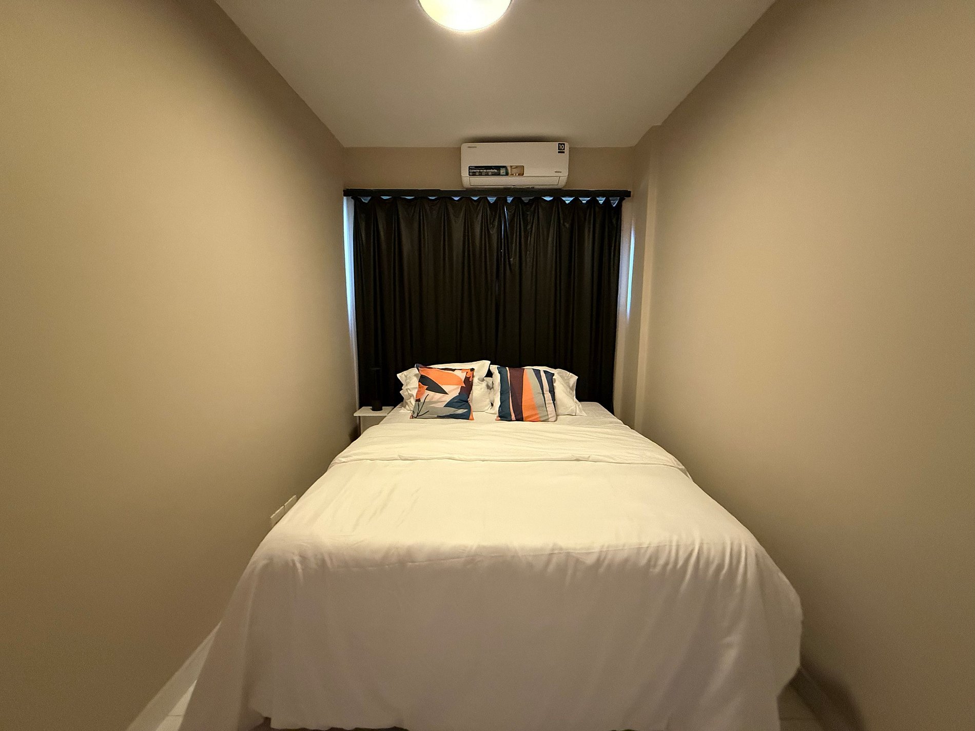 Dormitorio: Una cama queen, armarios, aire acondicionado y cortinas opacas.