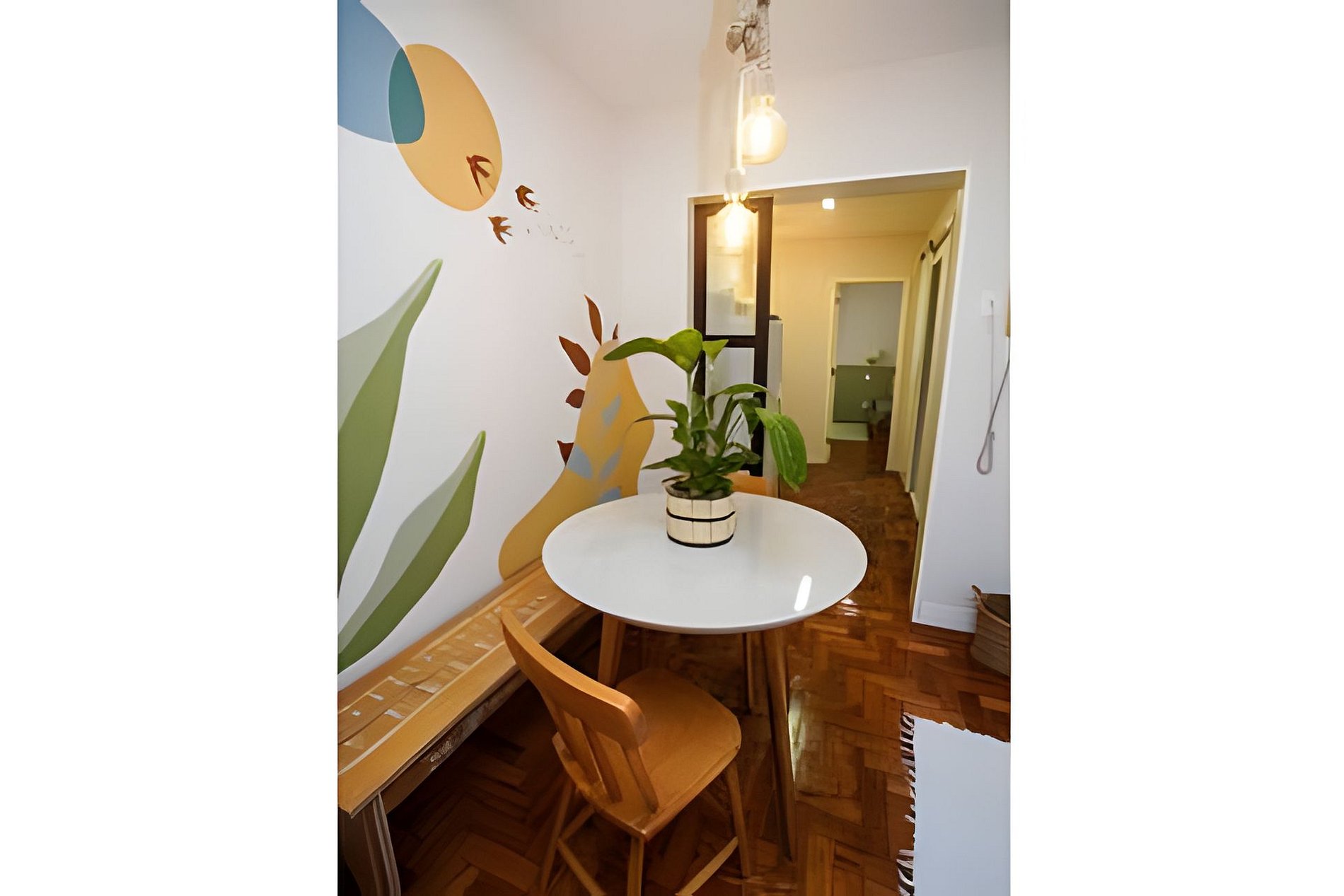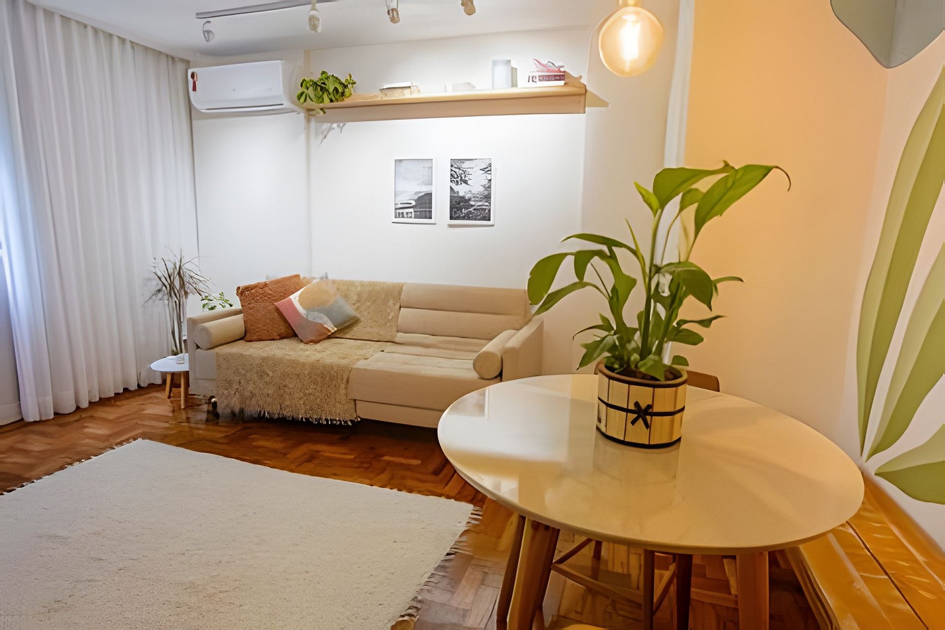 O apartamento conta com uma sala de estar aconchegante que disponibiliza wifi, tv a cabo, sofá- cama e ar-condicionado. Uma cozinha com todos os itens básicos necessários, como fogão, geladeira, cafeteira, microondas, forno, pratos, copos, talheres e panelas. Há também um quarto com cama de casal, roupas de cama, mesa para home office e ar-condicionado. O banheiro disponibiliza chuveiro quente e toalhas.