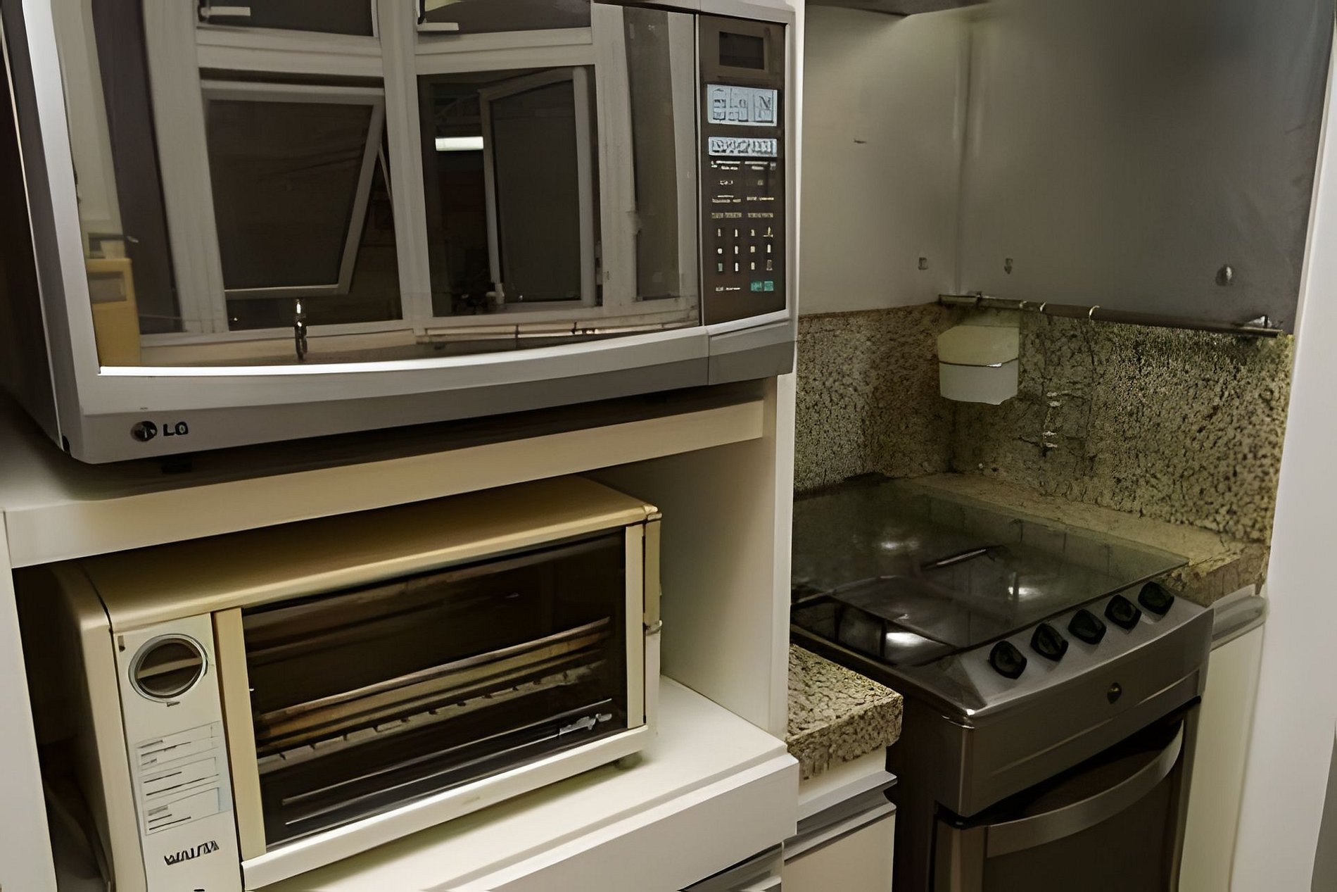 A cozinha disponibiliza todos os itens básicos necessários, como: geladeira, fogão, forno, microondas, torradeira, pratos, copos, panelas e talheres.