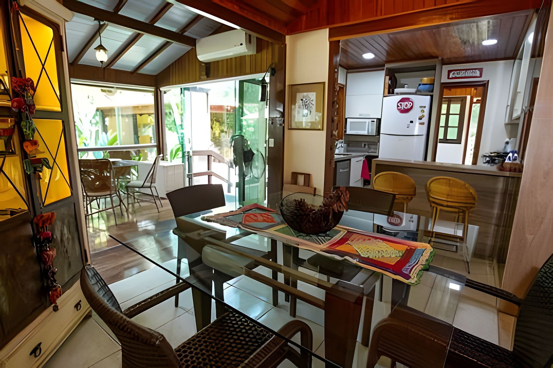 A casa possui sala de jantar e uma sala/varanda dupla, a cozinha é equipada com fogão, geladeira, microondas, air fryer, panelas, frigideiras, taças para vinho, cafeteira elétrica, liquidificador e sanduicheira.