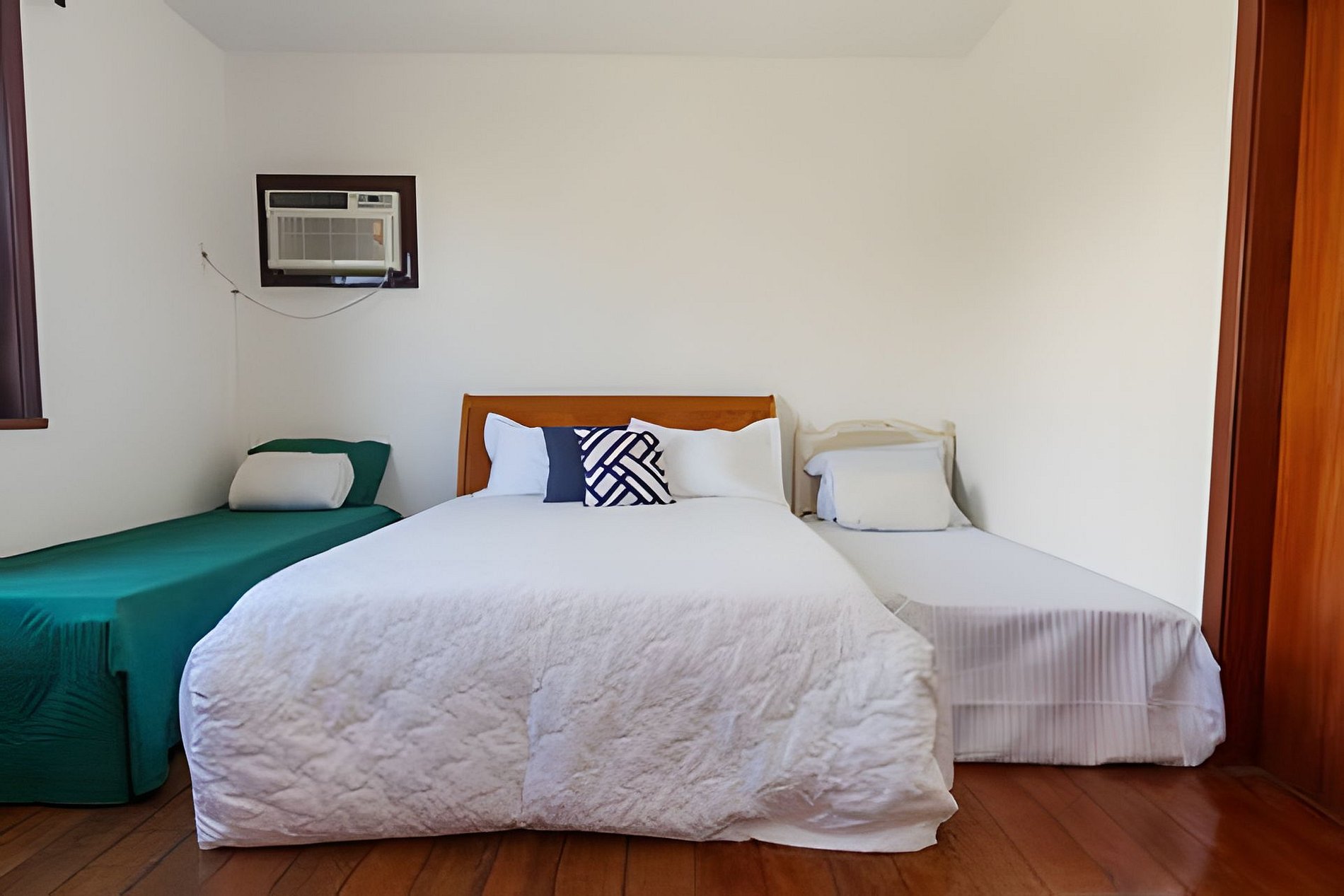 O local dispõe de 4 suítes, cada suíte é equipada com guarda-roupas, camas queen e camas de solteiro, proporcionando espaço e conforto para todos os hóspedes. Todas possuem ar condicionado e ventilador de teto, garantindo a climatização perfeita em qualquer estação do ano. Disponibilizamos um 5º quarto com cama de casal.