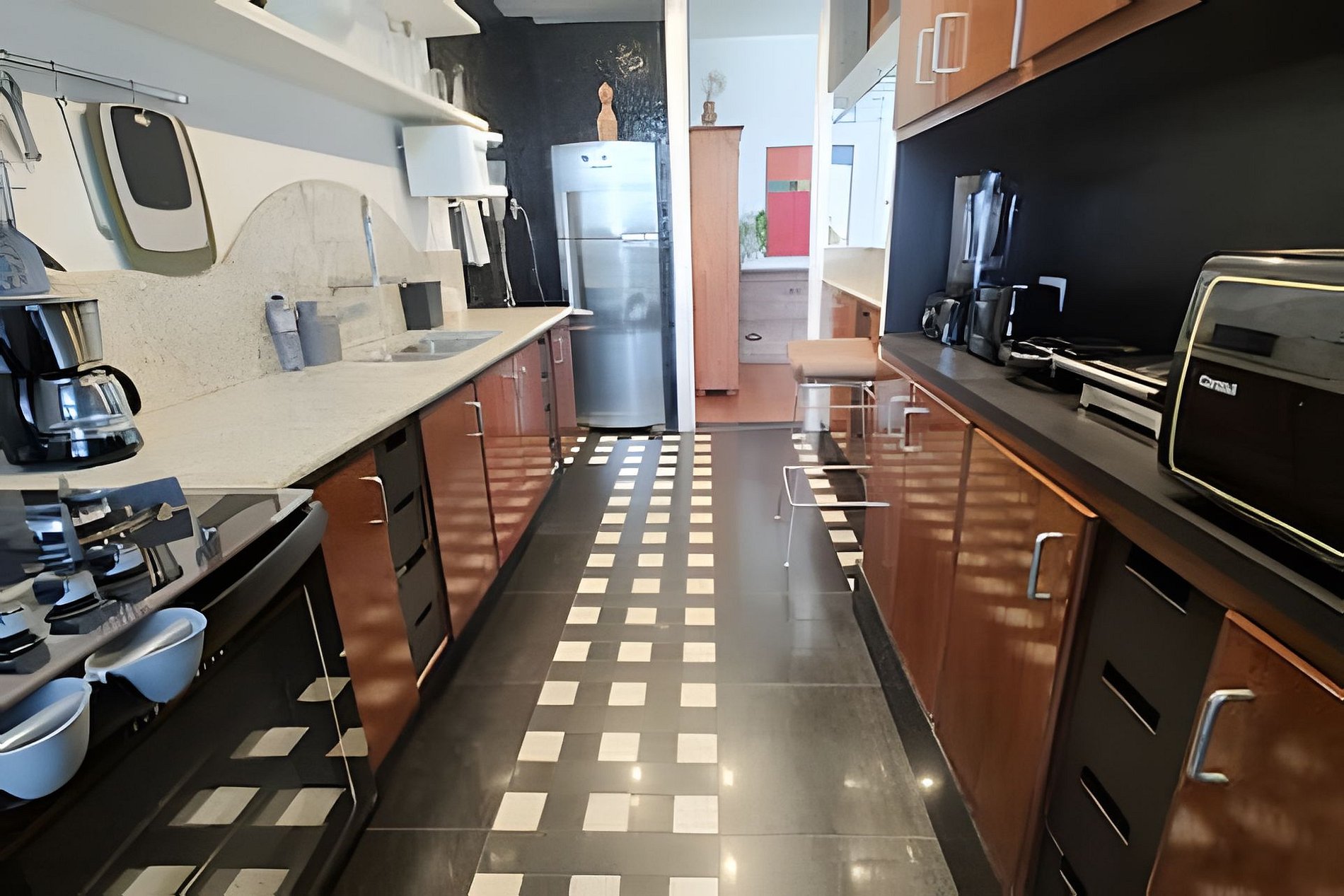 A ampla sala, de piso de madeira e super bem decorada, conta com um espaçoso e confortável sofá, ar condicionado, mesa de jantar, tv e varanda , alem de ter integrada a cozinha americana totalmente equipada de eletrodomésticos como geladeira, microondas, forno e fogão, liquidificador, sanduicheira, cafeteira e todos os utensilios necessários para o prepararo de deliciosas refeições. A área de serviço dispõem de máquina de lavar roupa, varal de teto, tábua e ferro de passar.
