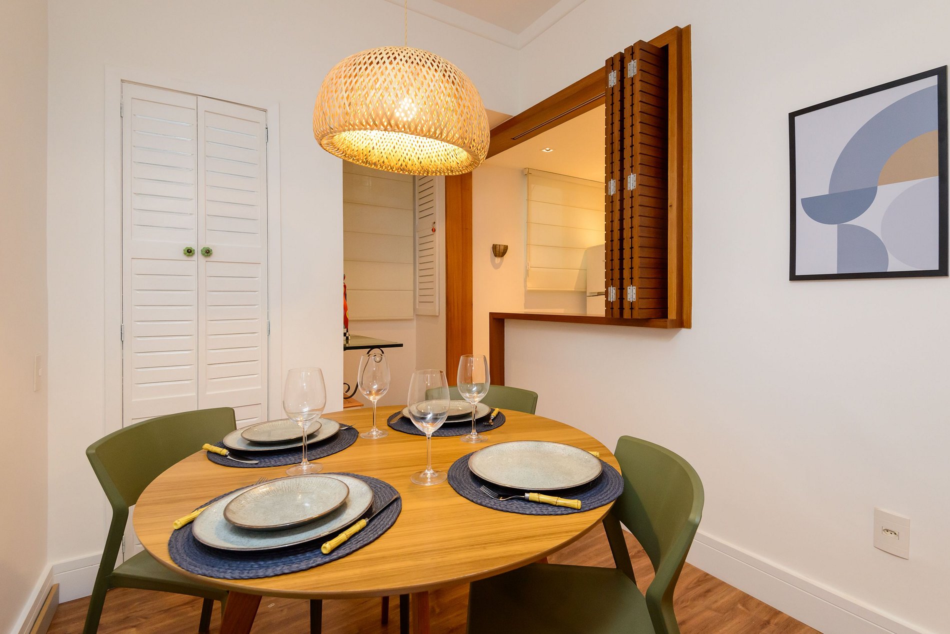 O apartamento foi recém reformado, bem decorado e equipado para garantir uma ótima experiência aos hóspedes. Dispõe de dois quartos, sendo um suíte e acomoda confortavelmente até 6 pessoas. A sala é equipada com Smart TV e sofá-cama para casal. Os dois quartos possuem camas queen-size, armários, ar condicionado e cortinas black out.