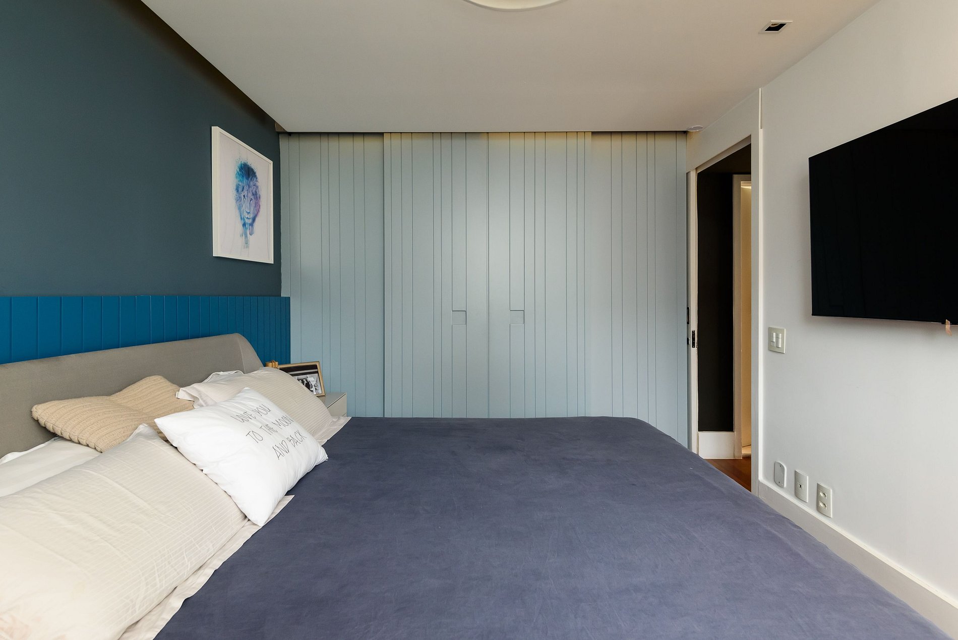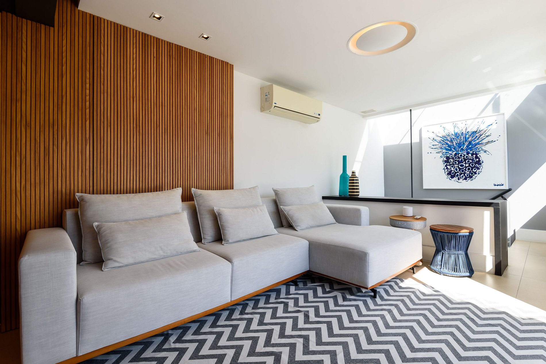 No segundo piso, temos uma suíte com cama king size e closet, sala de tv aconchegante que faz a transição para a área externa, onde estão a piscina, churrasqueira, cadeiras e guarda-sol, tudo isso acompanhado de uma vista deslumbrante do Cristo Redentor.