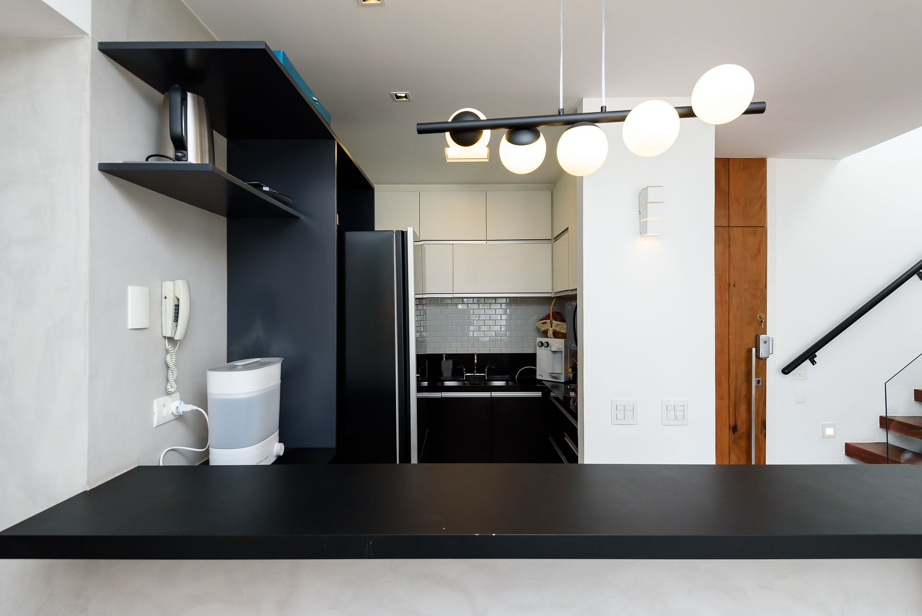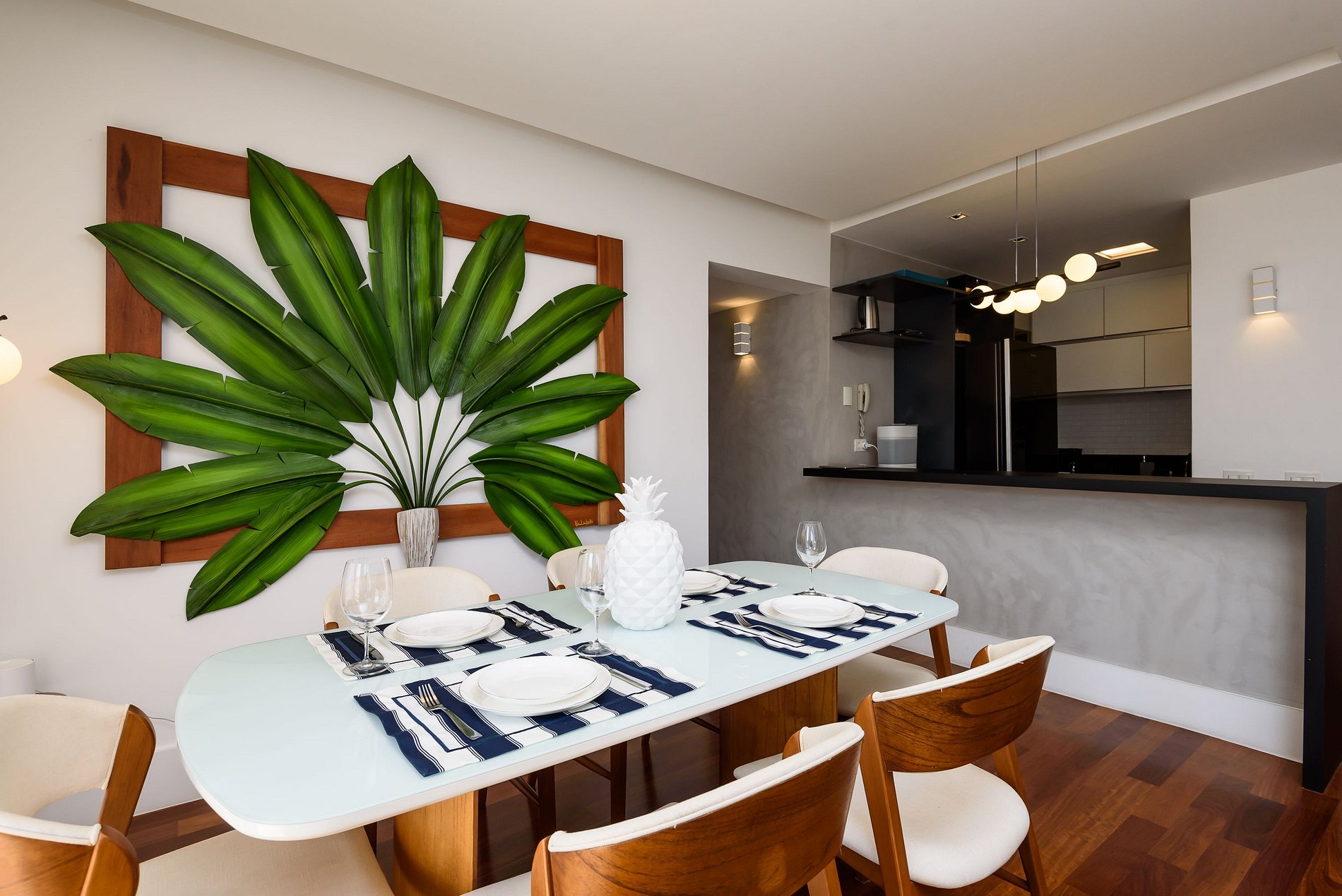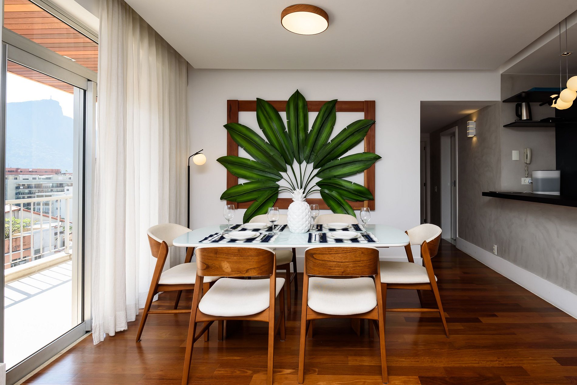 A cozinha é totalmente equipada, com fogão, geladeira, micro-ondas, panela elétrica, sanduicheira, cafeteira e filtro de água. Uma varanda charmosa, com mesa para café da manhã e vista direta para o Cristo, completa o ambiente. A área de serviço conta com máquina de lavar roupa.