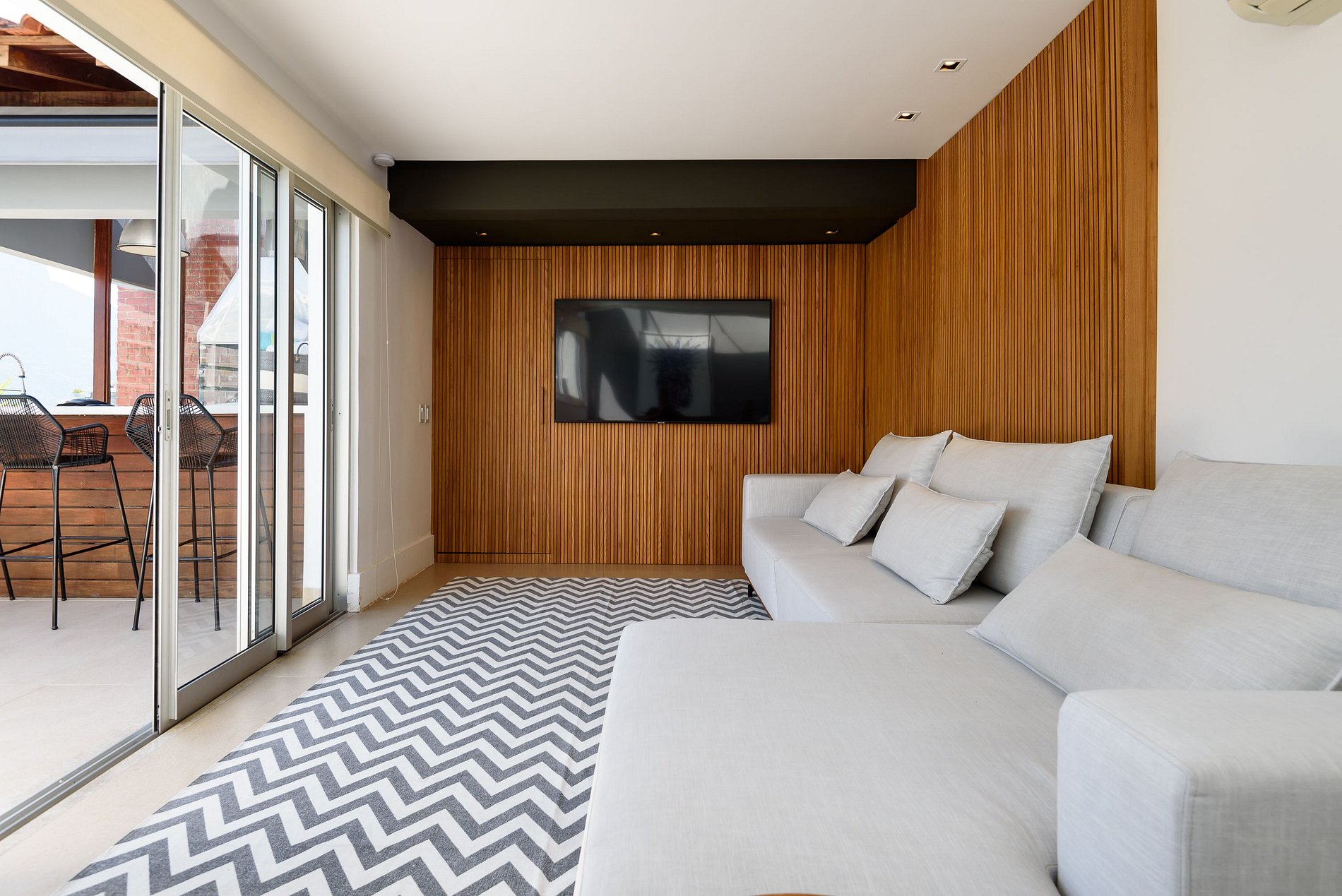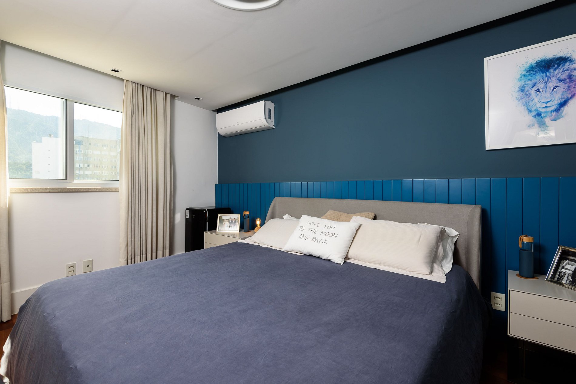 No segundo piso, temos uma suíte com cama king size e closet, sala de tv aconchegante que faz a transição para a área externa, onde estão a piscina, churrasqueira, cadeiras e guarda-sol, tudo isso acompanhado de uma vista deslumbrante do Cristo Redentor.