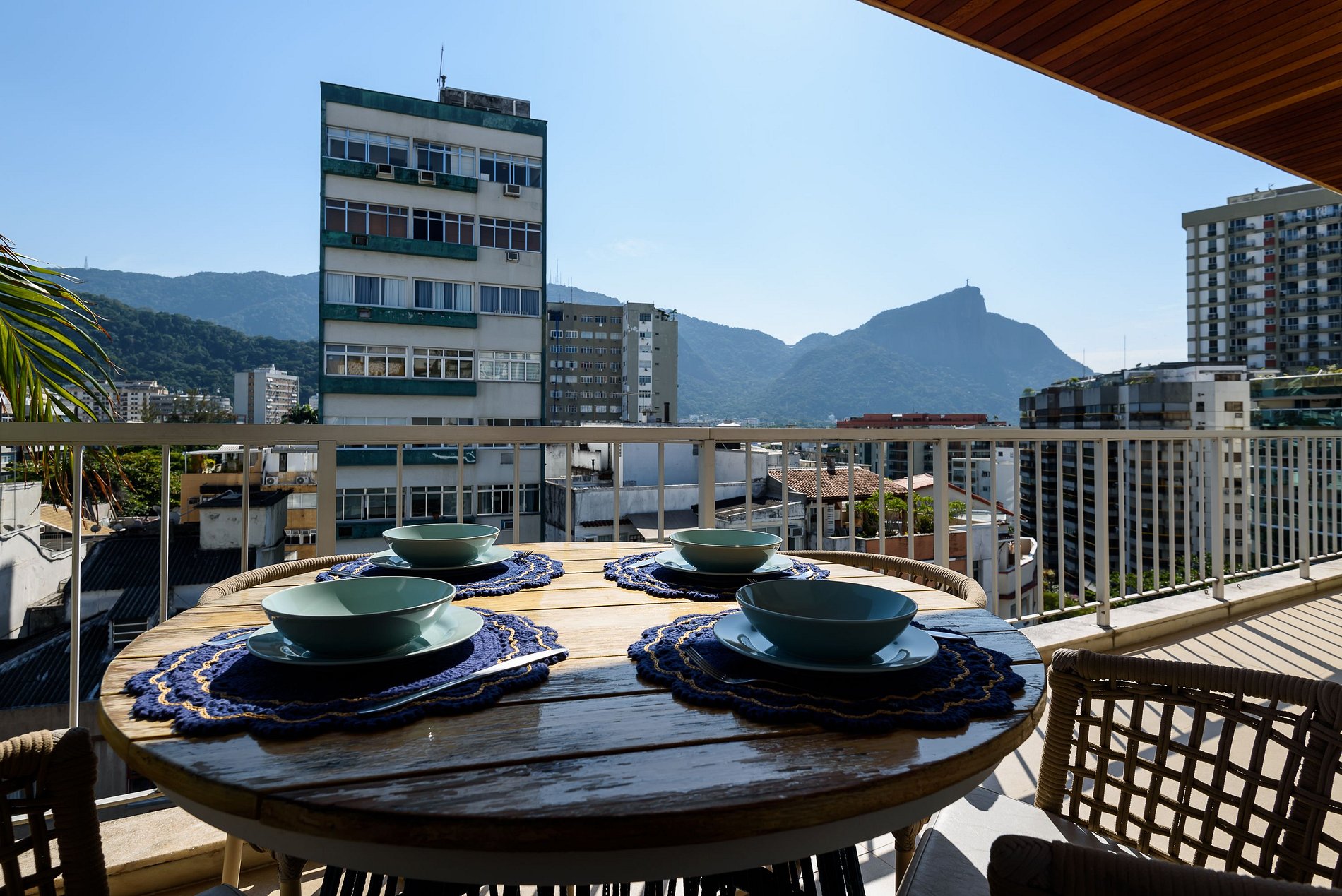 A cozinha é totalmente equipada, com fogão, geladeira, micro-ondas, panela elétrica, sanduicheira, cafeteira e filtro de água. Uma varanda charmosa, com mesa para café da manhã e vista direta para o Cristo, completa o ambiente. A área de serviço conta com máquina de lavar roupa.