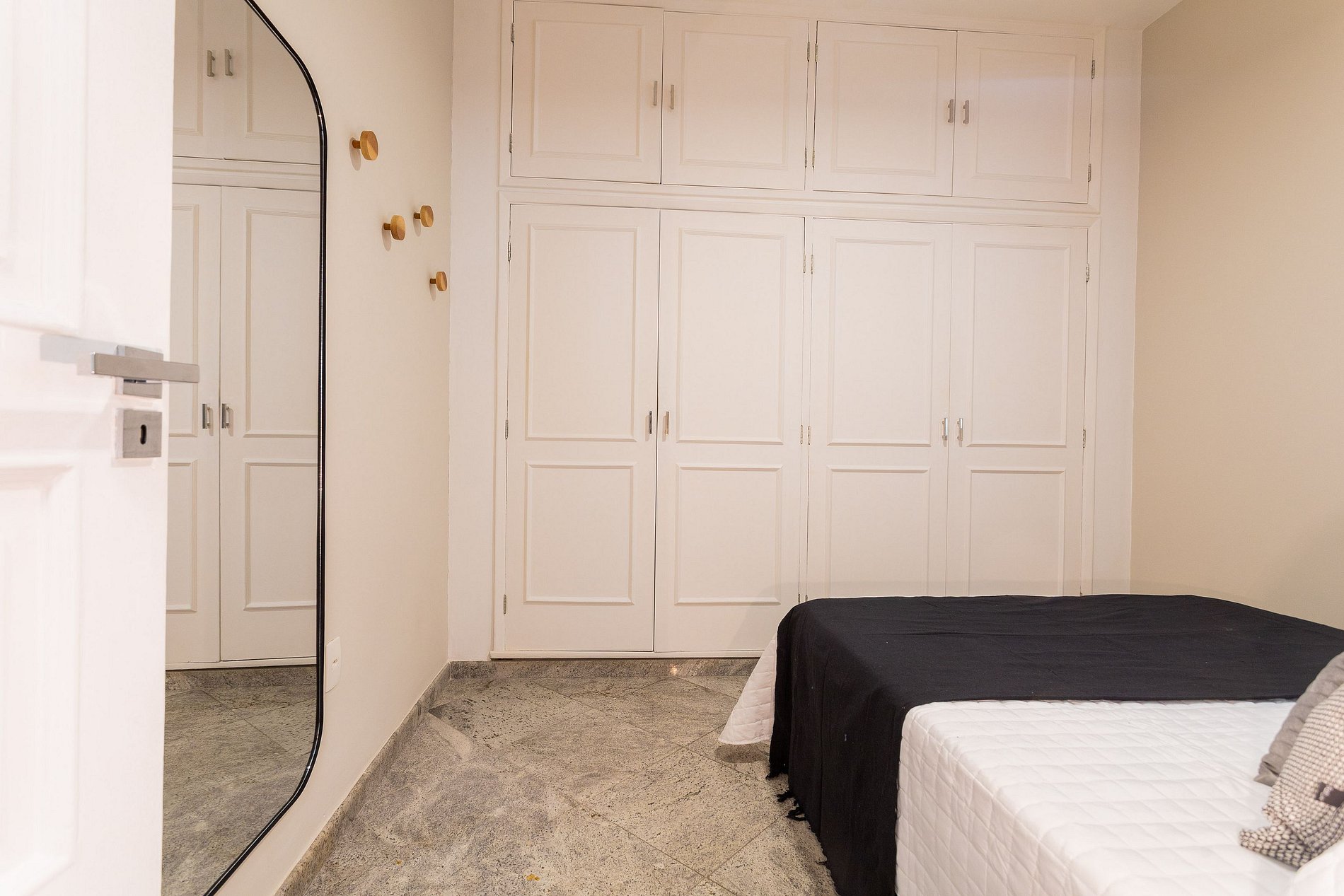 Quarto 3: Cama Queen, armário, ar condicionado e cortinas black out.