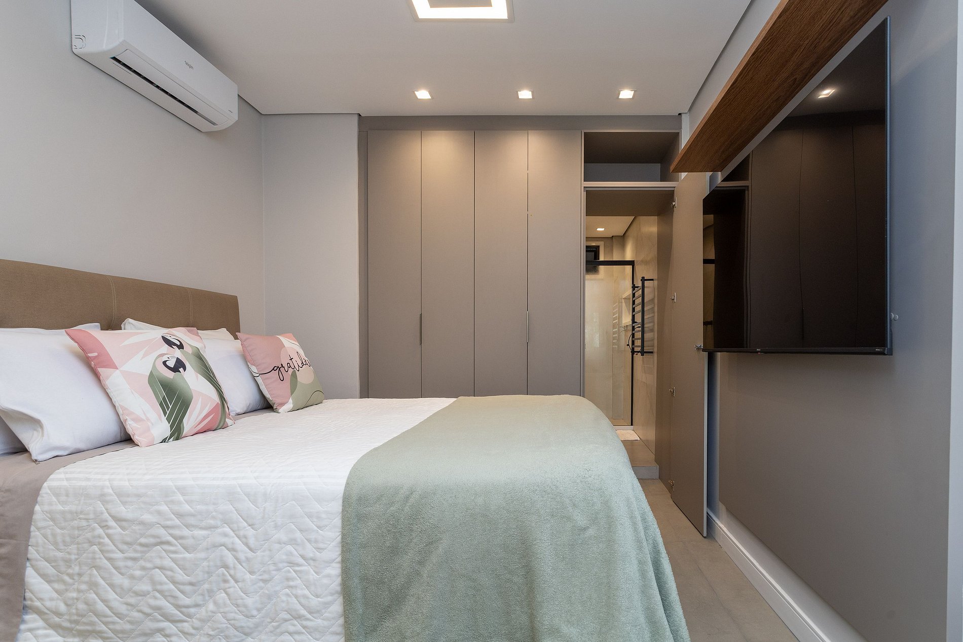 Quarto suíte 1: Cama Queen, guarda roupa, mesa de trabalho, ar condicionado, smart tv 58 polegadas e black out.