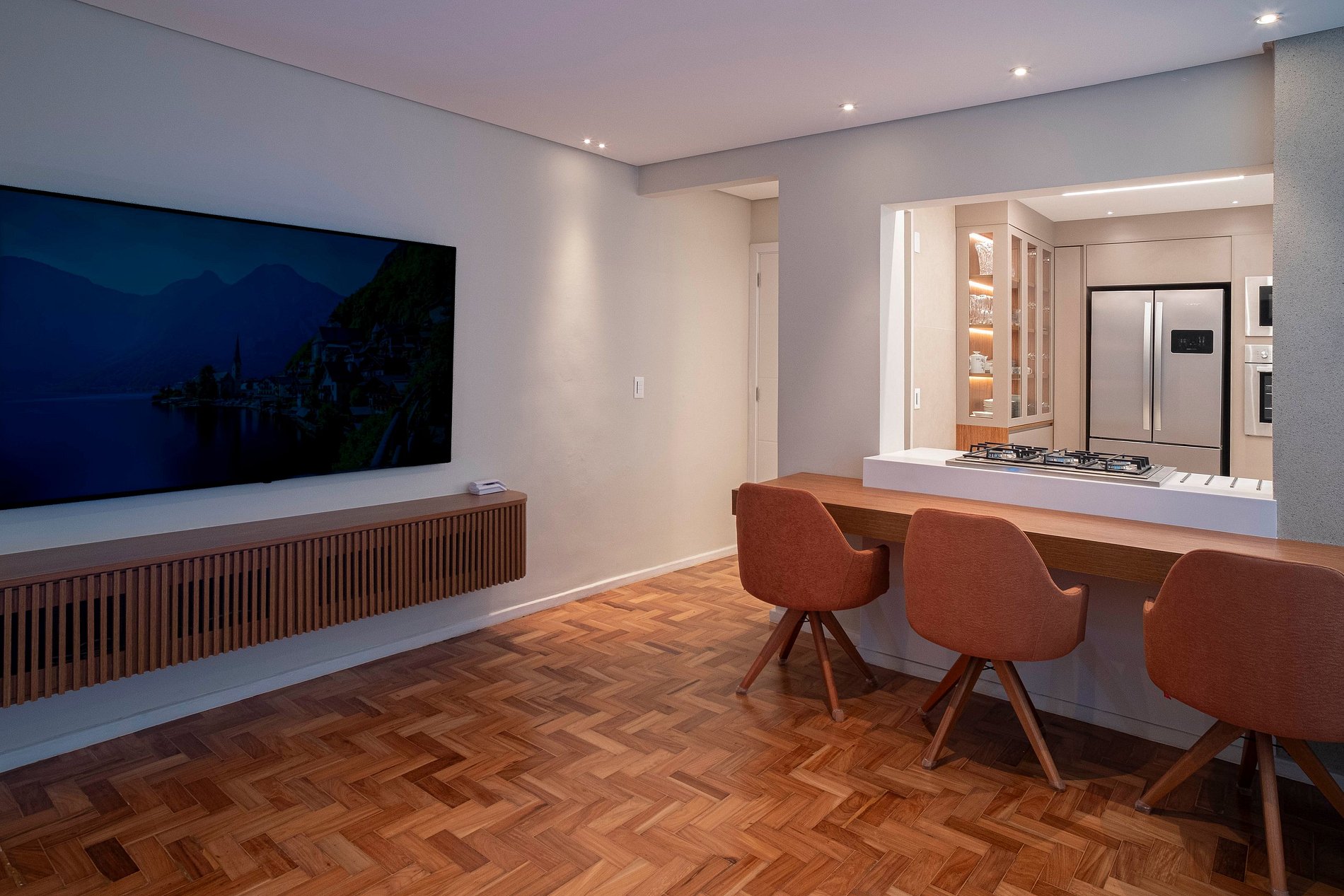 Sala: 1 sofá, mesa com 4 lugares, 1 Smart Tv de 75 polegadas e ar condicionado.