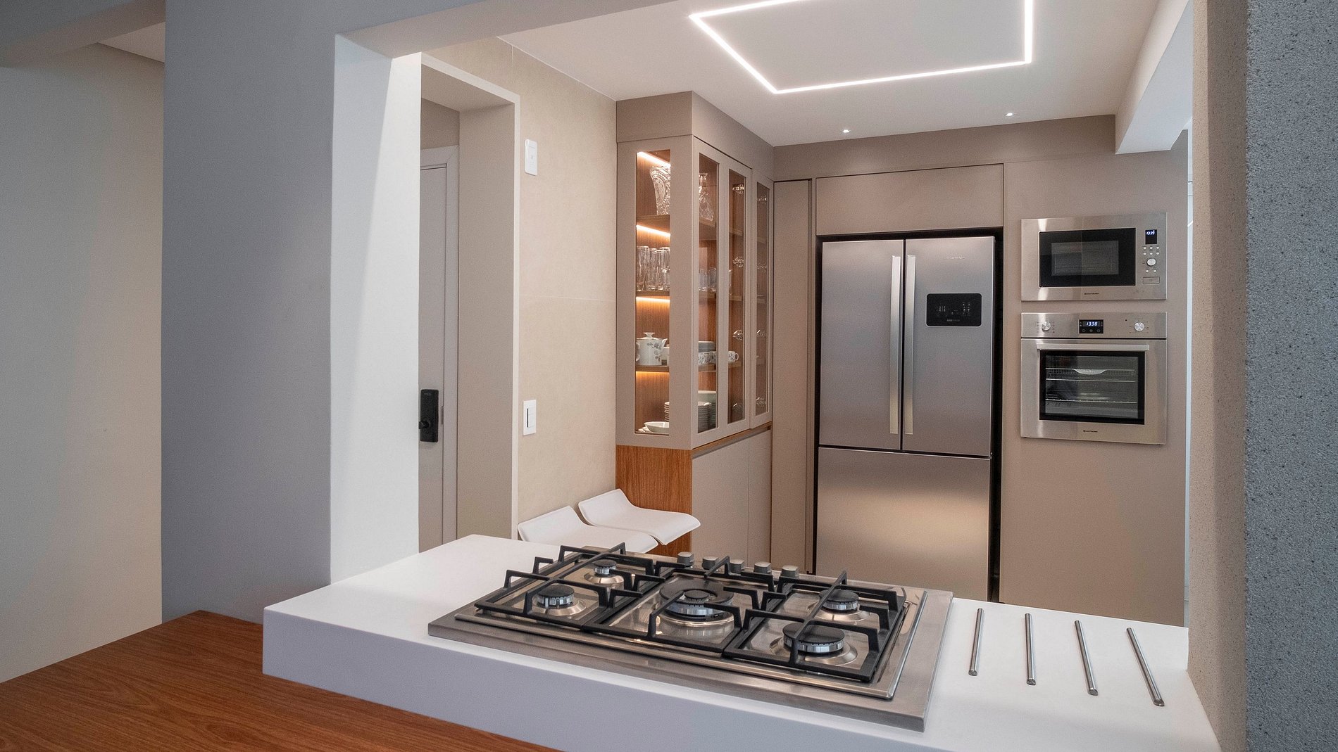 Cozinha: Fogão, forno, filtro para café, microondas, torradeira, lava louça, máquina lava e seca, panelas, pratos, copos e talheres.