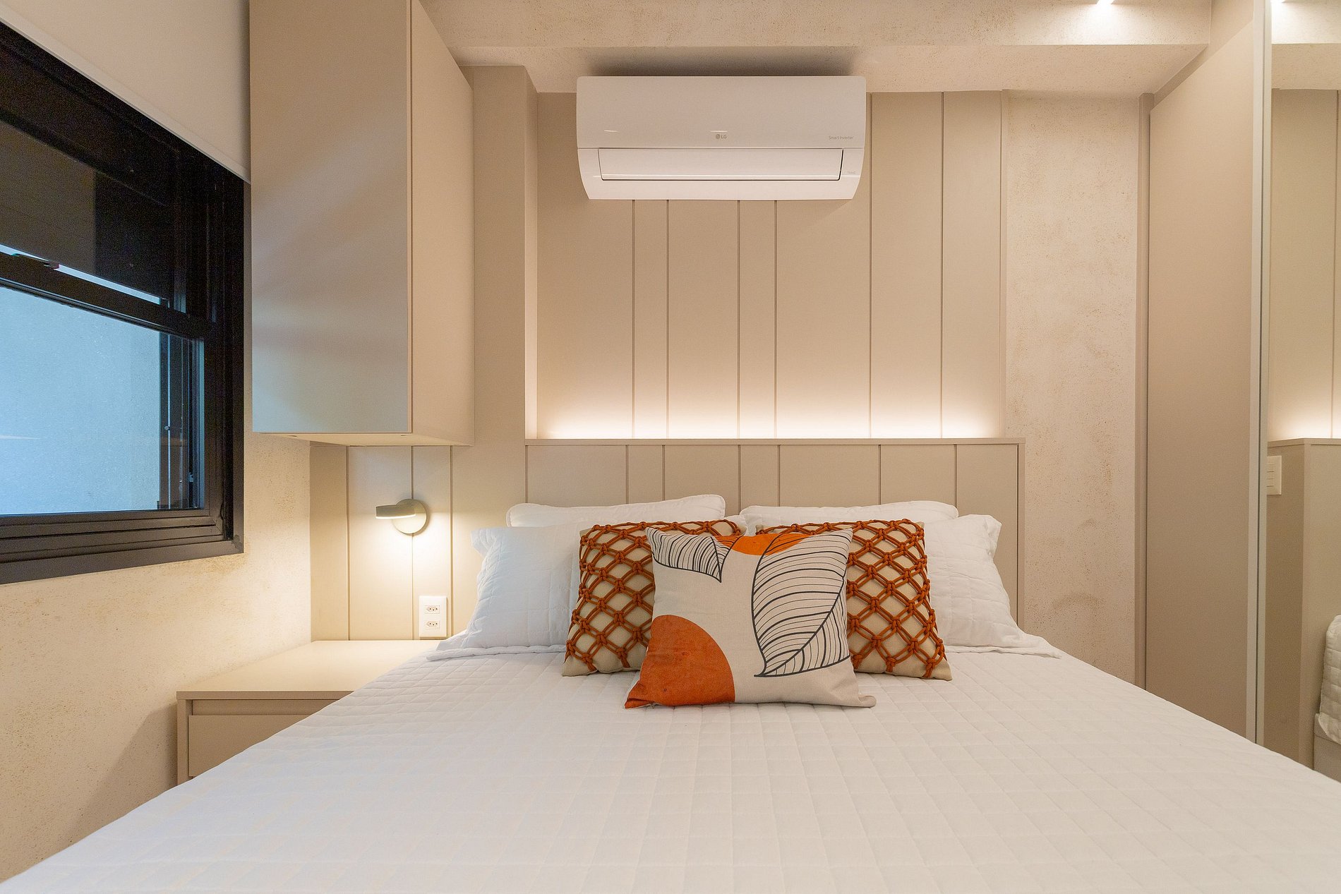 O quarto possui uma cama casal queen, arara para roupas, cortinas black out e ar condicionado.