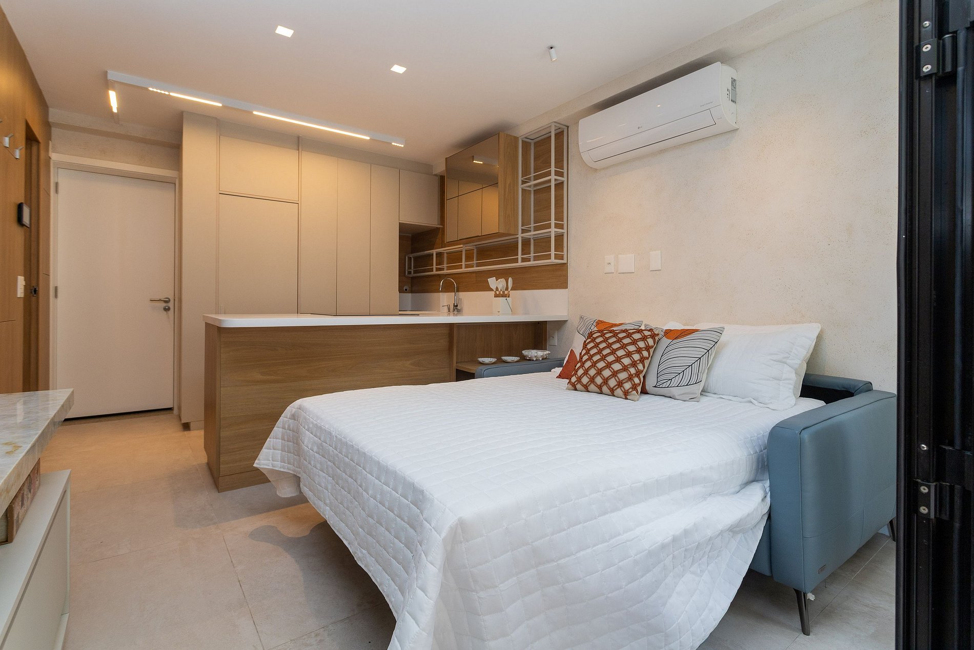 A sala de estar, é aconchegante e equipada com um sofá-cama, smartv, cortinas black out e ar condicionado, conjugada com a cozinha americana, que possui fogão, forno e geladeira.