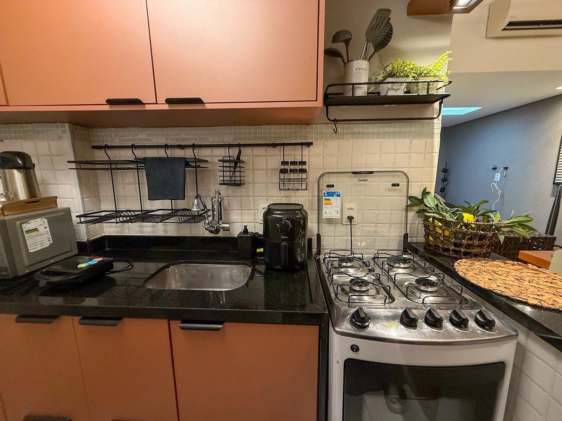 O apartamento é montado em um estilo estúdio, com quarto e sala integrados, a cozinha e o banheiro são completos, contendo também uma área externa, que agrega bastante na comodidade do imóvel.