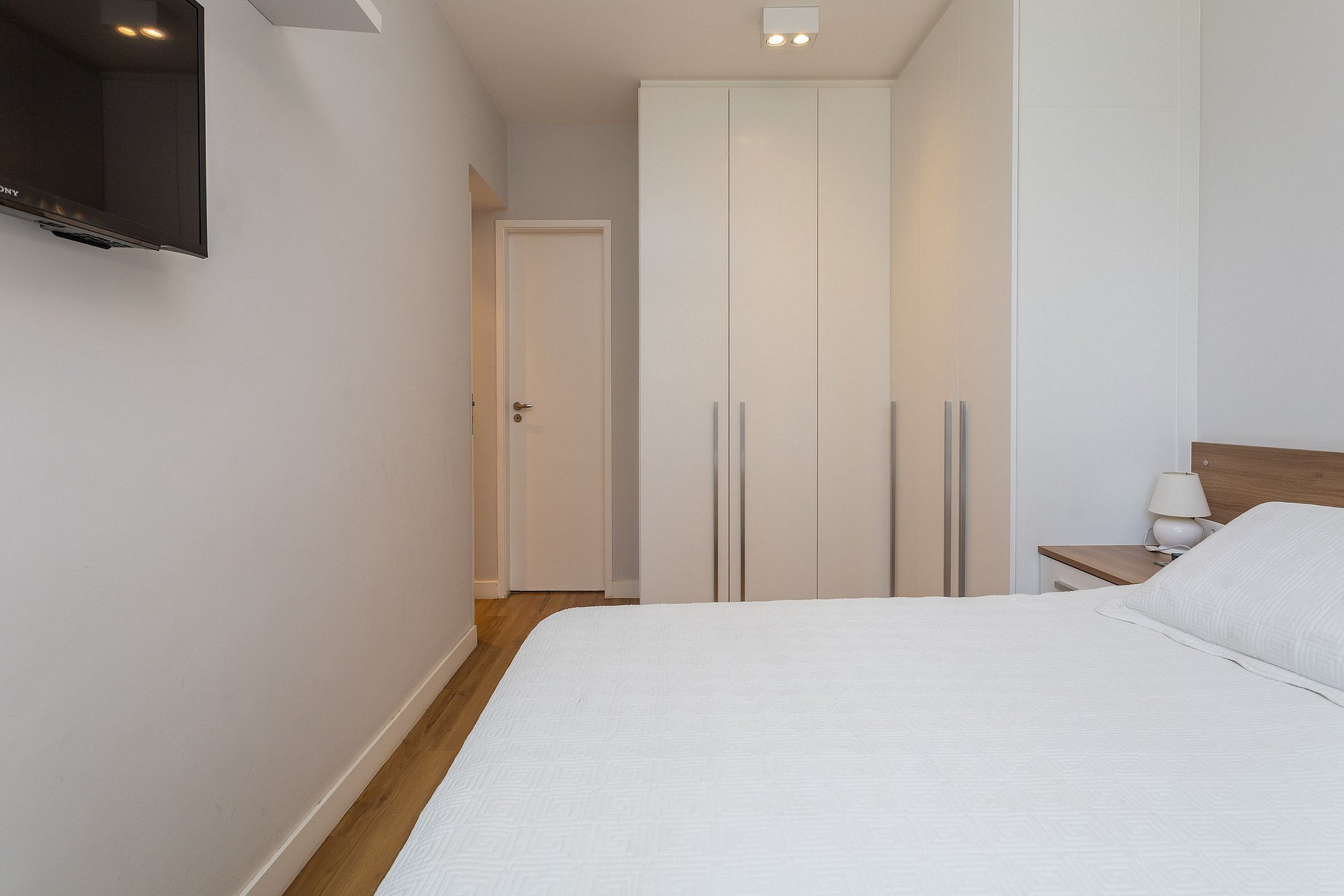 O flat é bem equipado, e atende confortavelmente à 2 pessoas. A suíte possui uma cama de casal padrão, banheiro completo, smartv, armário, ar condicionado e cortinas blackout. A sala possui um sofá, smartv, mesa com quatro lugares, ar condicionado, cortinas blackout, e uma varanda com uma cadeira. A cozinha possui geladeira, fogão, forno, micro-ondas, talheres, pratos, panelas, copos e utensílios de cozinha.